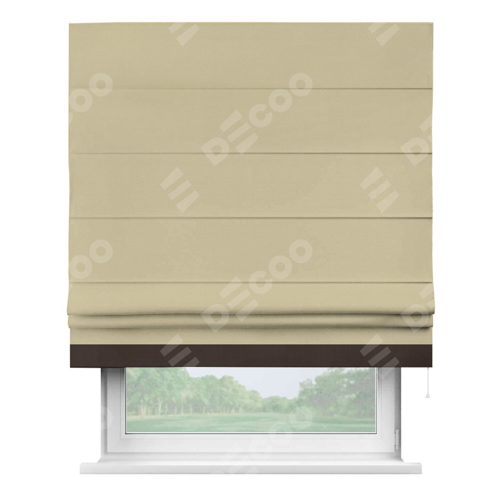 Римская штора производителя «Cortin», используется для проёма, пошита из ткани блэкаут однотонный кофейный, артикул ткани 13130. Отделка шторы кантом «Джестер», ткань для канта используется из блэкаута однотонного разной расцветки на выбор. Имеет универсальный механизм и подходит для монтажа: на потолок, на стену и в нишу.