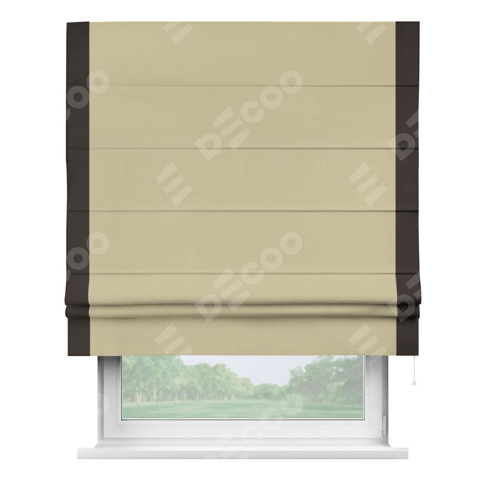 Римская штора производителя «Cortin», используется для проёма, пошита из ткани блэкаут однотонный кофейный, артикул ткани 13130. Отделка шторы кантом «Стрим Дуо», ткань для канта используется из блэкаута однотонного разной расцветки на выбор. Имеет универсальный механизм и подходит для монтажа: на потолок, на стену и в нишу.