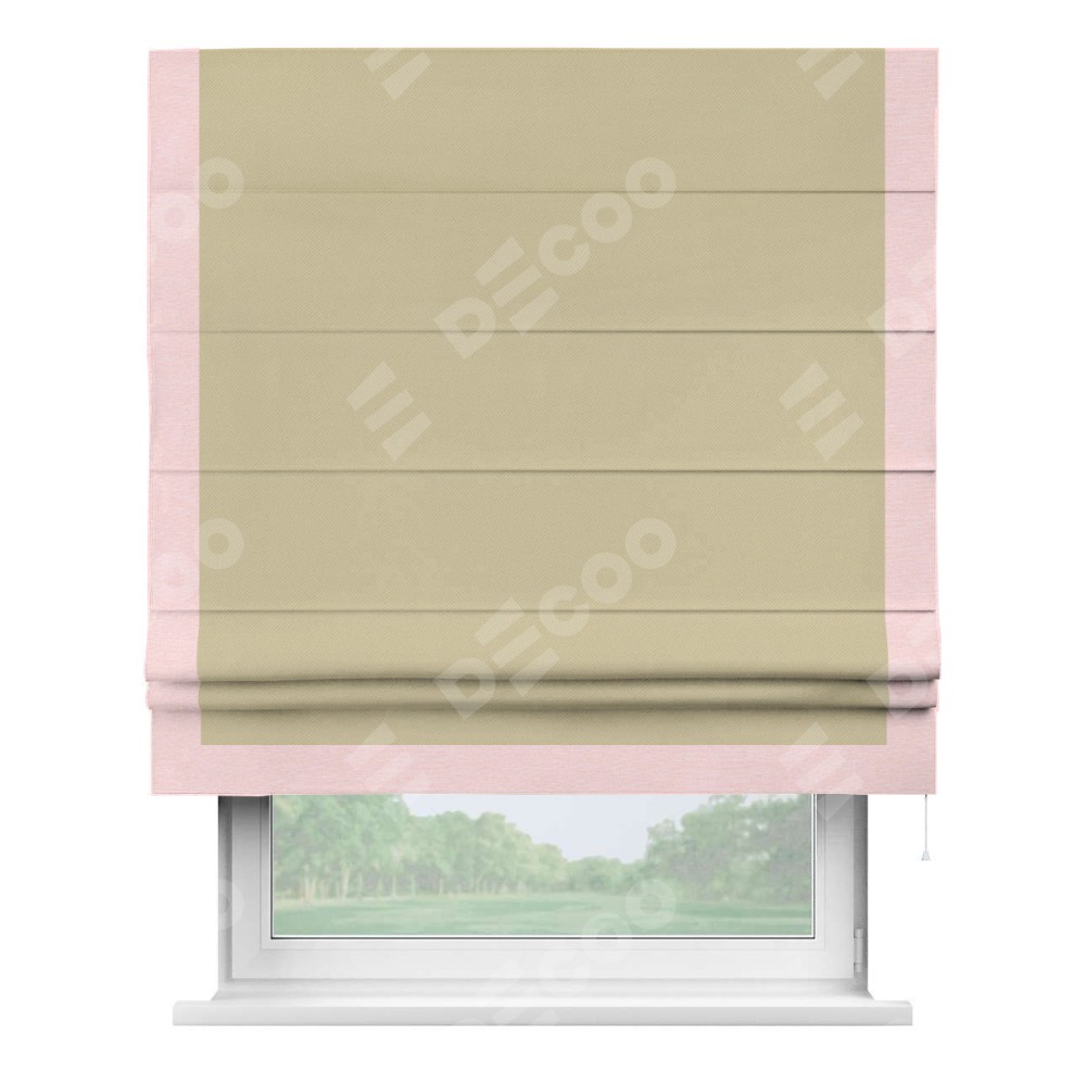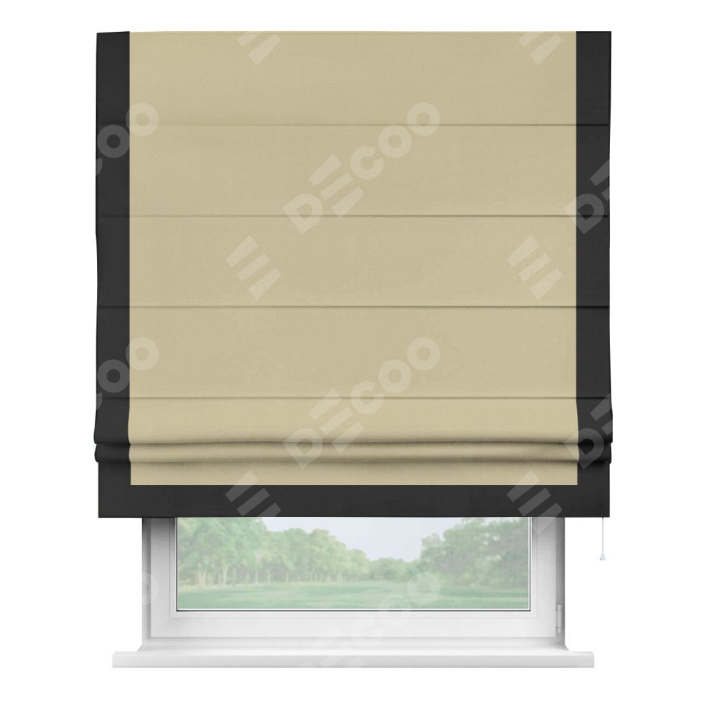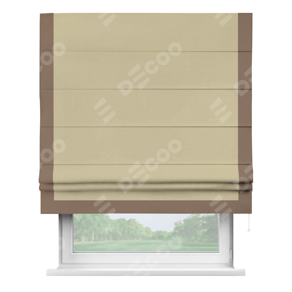 Римская штора производителя «Cortin», используется для проёма, пошита из ткани блэкаут однотонный кофейный, артикул ткани 13130. Отделка шторы кантом «Виктория», ткань для канта используется из блэкаута однотонного разной расцветки на выбор. Имеет универсальный механизм и подходит для монтажа: на потолок, на стену и в нишу.
