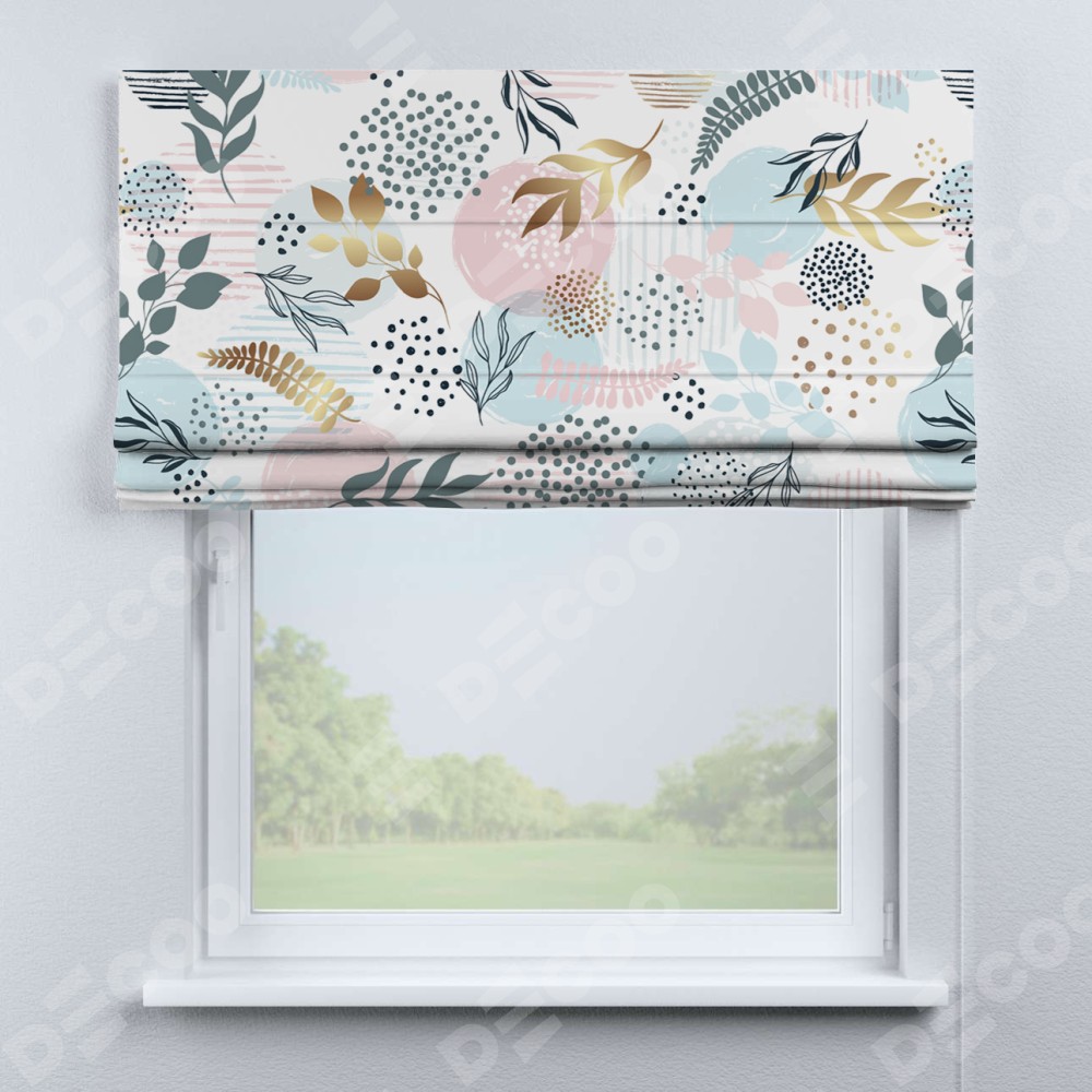 Римская штора производителя «Cortin», используется для проёма, пошита из ткани блэкаут с нанесением сублимационной печати «Точки и листочки». Имеет универсальный механизм и подходит для монтажа: на потолок, на стену и в нишу.