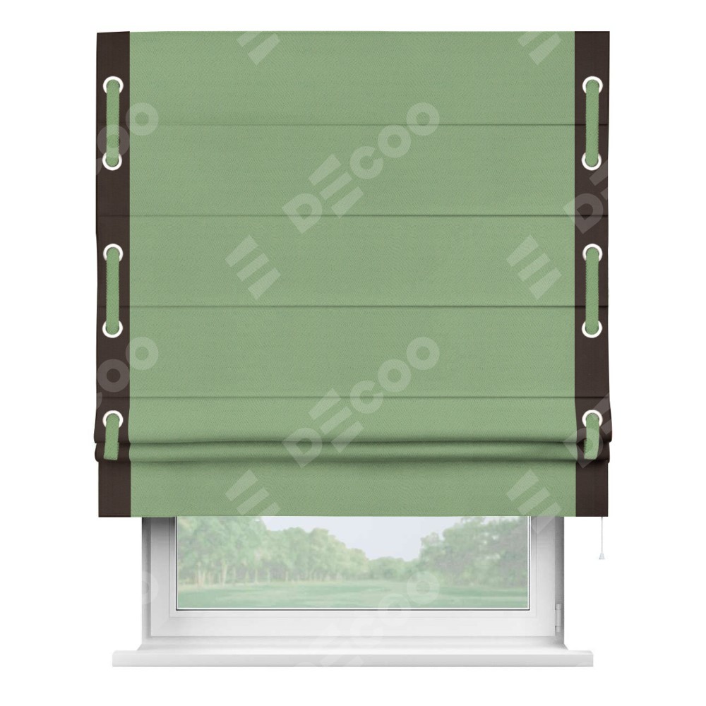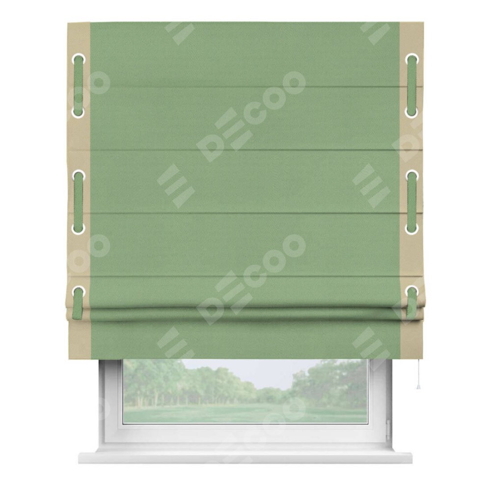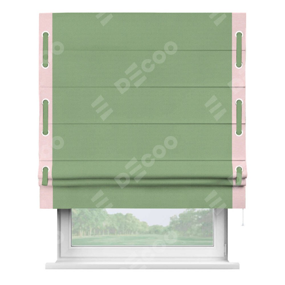 Римская штора производителя «Cortin», используется для проёма, пошита из ткани блэкаут однотонный оливковый, артикул ткани 88300. Отделка шторы кантом «Стрим Дуо» на кантах расположены люверсы с пояском, ткань для канта используется из блэкаута однотонного разной расцветки на выбор. Ткань для пояска обычно используется из основной ткани шторы, а так же можно сделать из любой расцветки по желанию. Имеет универсальный механизм и подходит для монтажа: на потолок, на стену и в нишу.