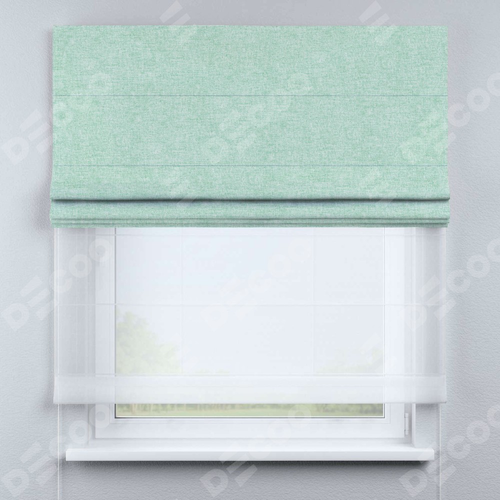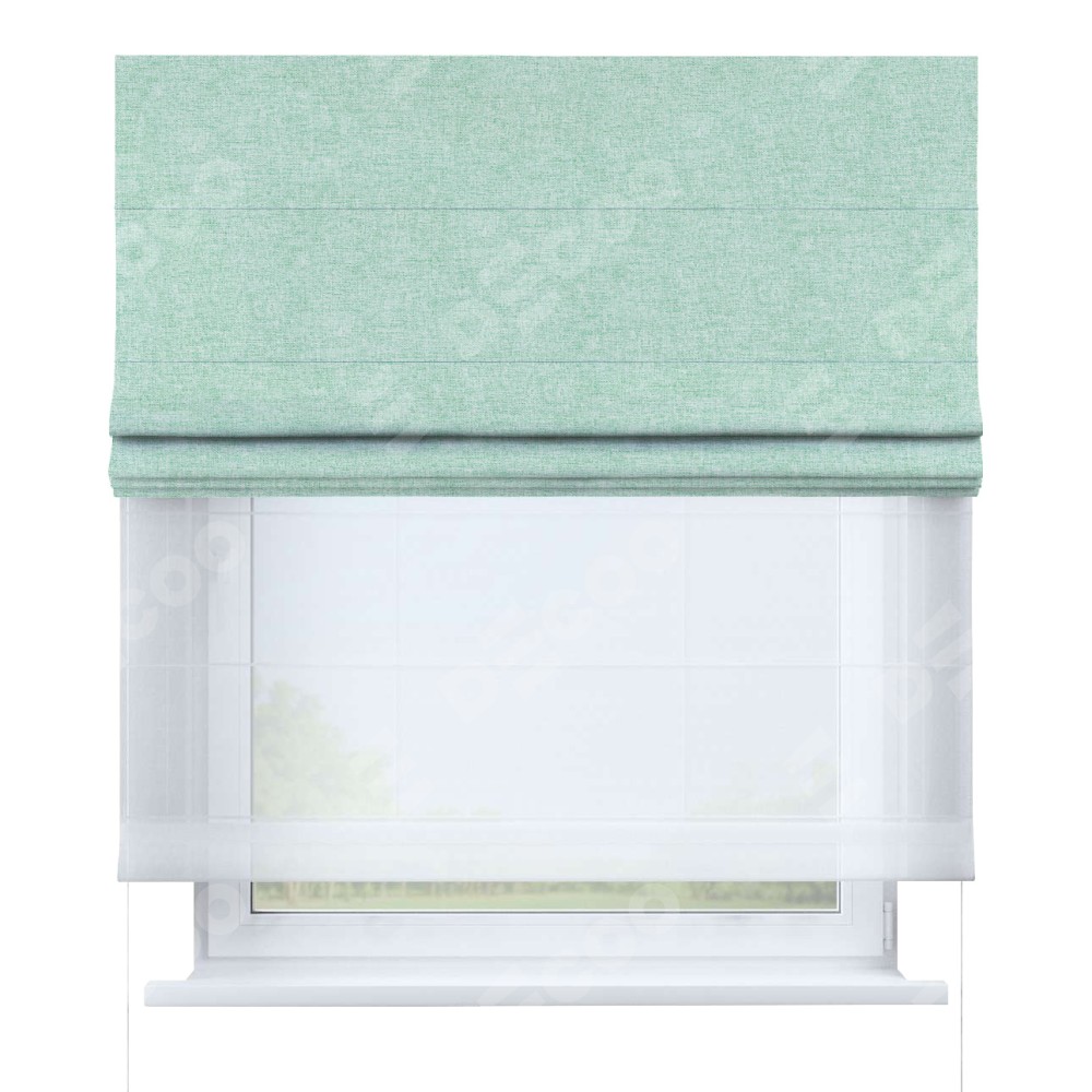 Римская штора день-ночь производителя «Cortin», используется для проёма, пошита из двух полотен, с лицевой стороны лён кашемир мятный артикул 21617, вторая ткань тюль (по стандарту комплектуется тюль белого цвета артикул V-01). Имеет универсальный механизм и подходит для монтажа: на потолок, на стену и в нишу.
