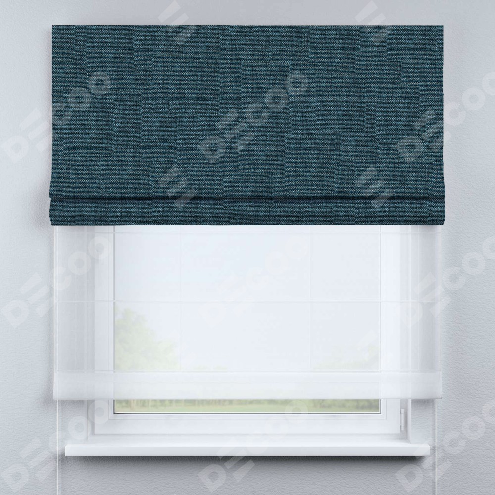 Римская штора день-ночь производителя «Cortin», используется для проёма, пошита из двух полотен, с лицевой стороны лён кашемир синий артикул 21623, вторая ткань тюль (по стандарту комплектуется тюль белого цвета артикул V-01). Имеет универсальный механизм и подходит для монтажа: на потолок, на стену и в нишу.