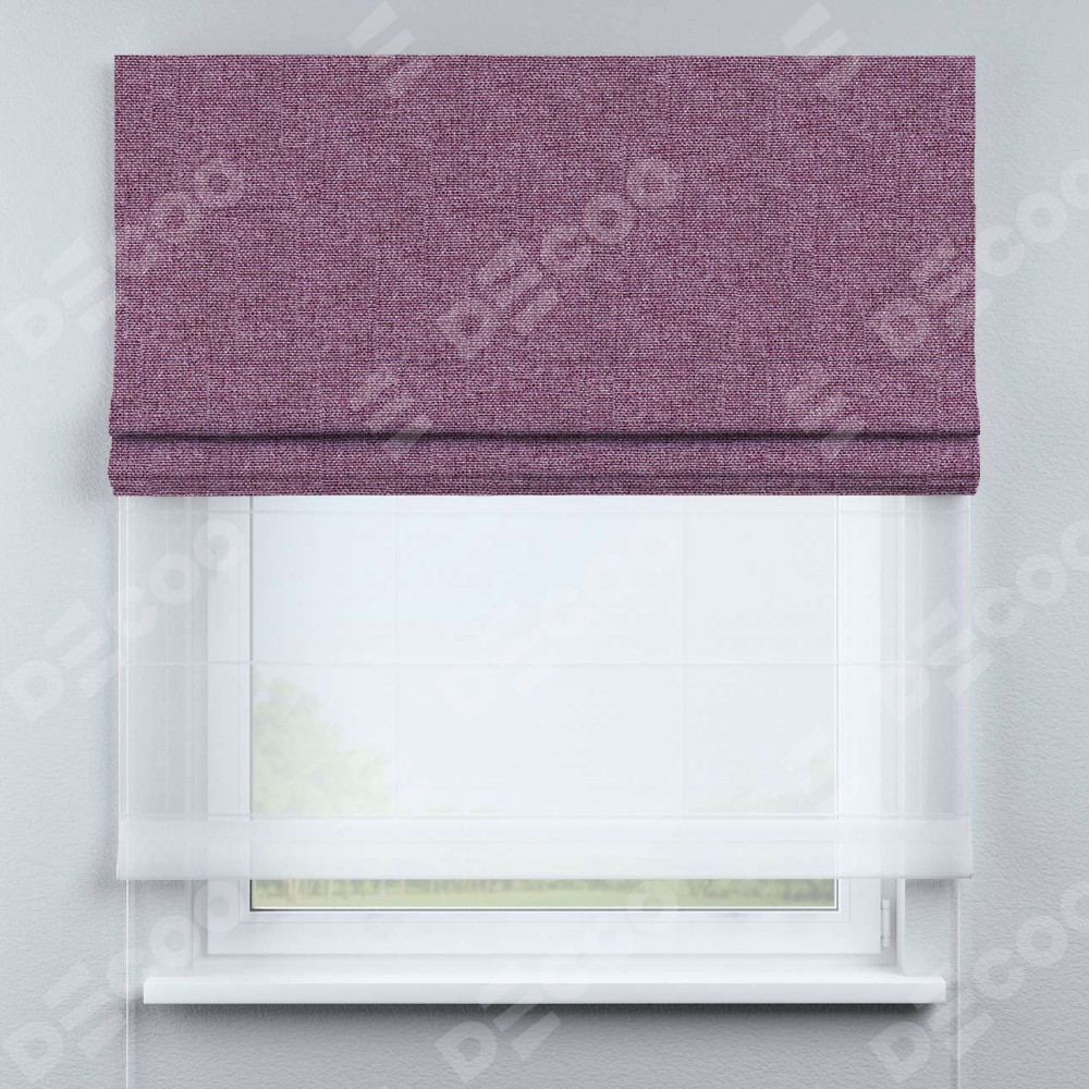 Римская штора день-ночь производителя «Cortin», используется для проёма, пошита из двух полотен, с лицевой стороны лён кашемир сиреневый артикул 21620, вторая ткань тюль (по стандарту комплектуется тюль белого цвета артикул V-01). Имеет универсальный механизм и подходит для монтажа: на потолок, на стену и в нишу.