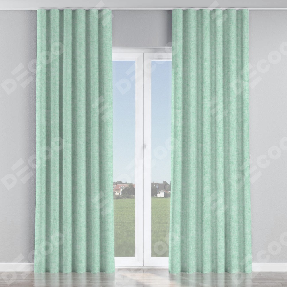 Комплект прямых штор, от производителя «Cortin», пошиты из ткани лён кашемир мятный, артикул ткани 21617. С изнаночной стороны в верхней части штор пристрачивается шторная лента с декоративными складками «Волна». Для создания элегантных складок прямые шторы шьются по стандарту с коэффициентом 1:2 (на 100 см. ширины проёма 200 см. ширины ткани).