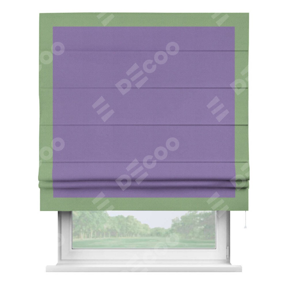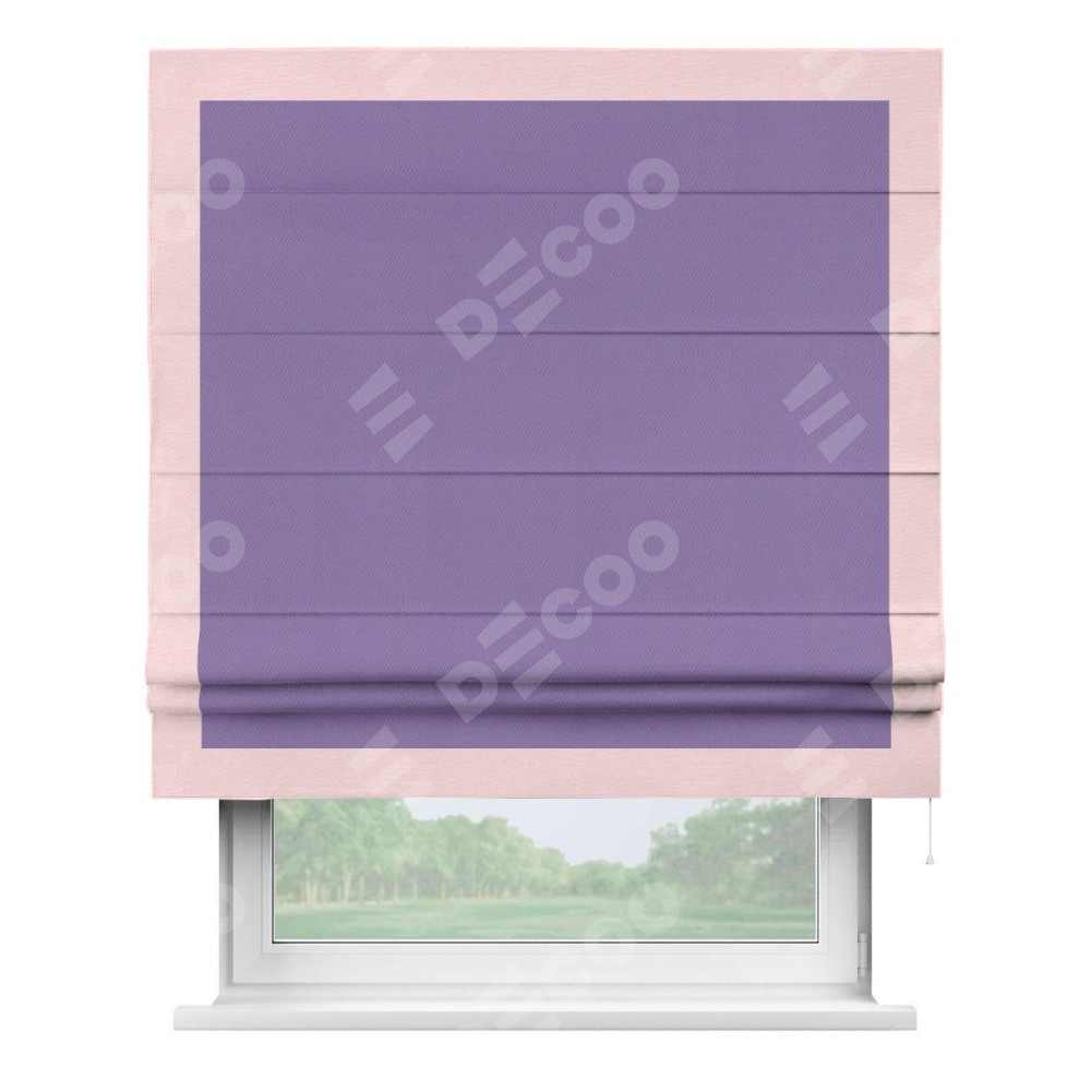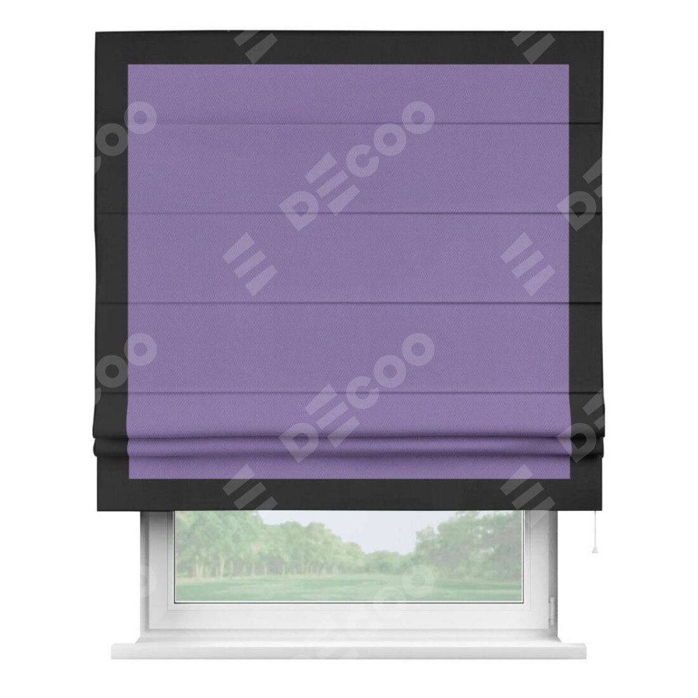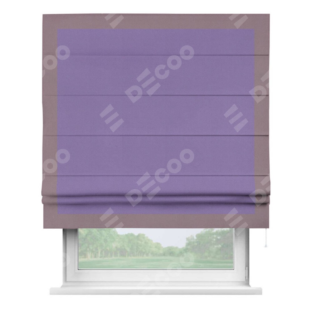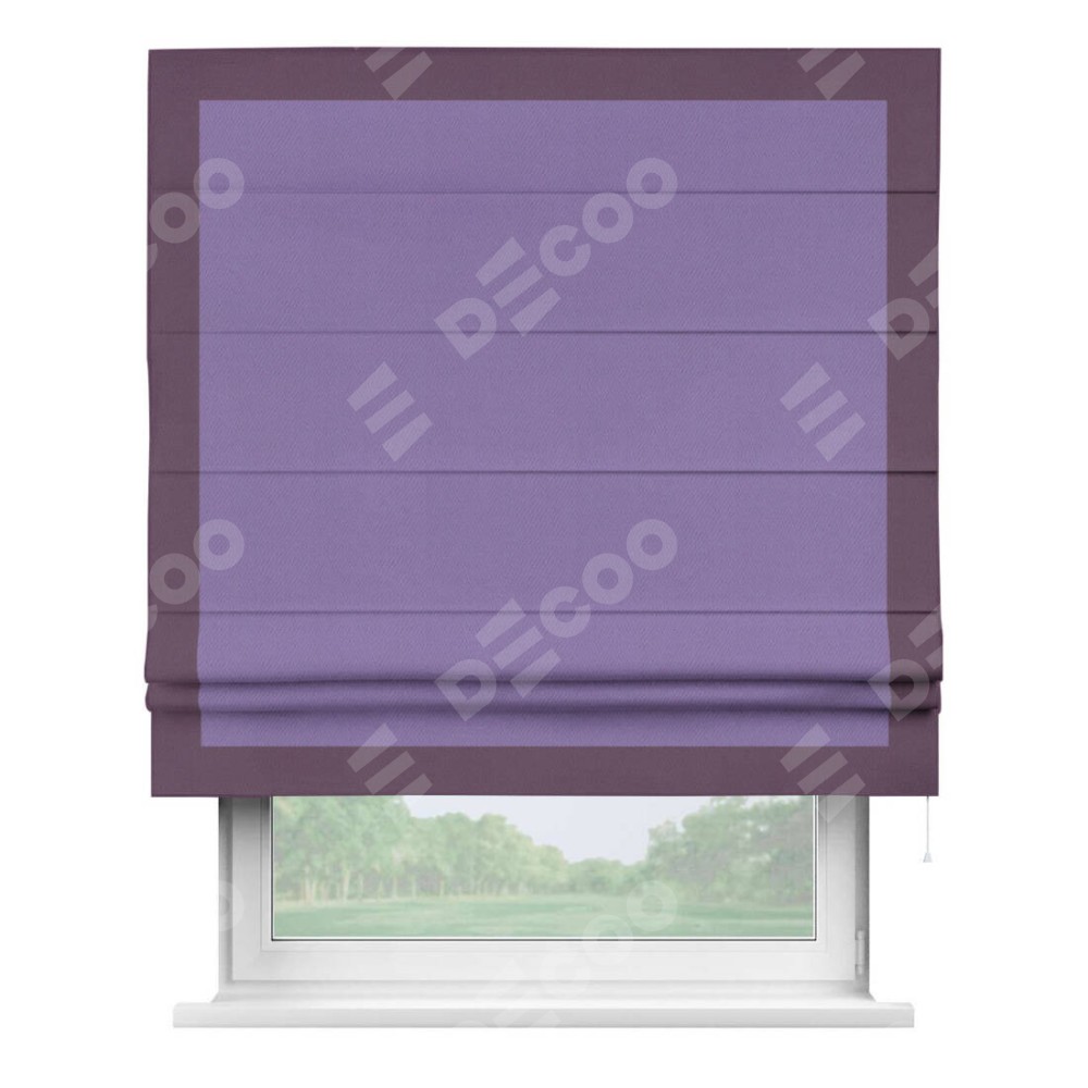 Римская штора производителя «Cortin», используется для проёма, пошита из ткани блэкаут однотонный сиреневый, артикул ткани 88305. Отделка шторы кантом «Чесс», ткань для канта используется из блэкаута однотонного разной расцветки на выбор. Имеет универсальный механизм и подходит для монтажа: на потолок, на стену и в нишу.
