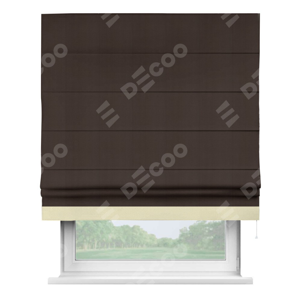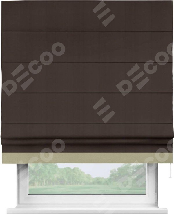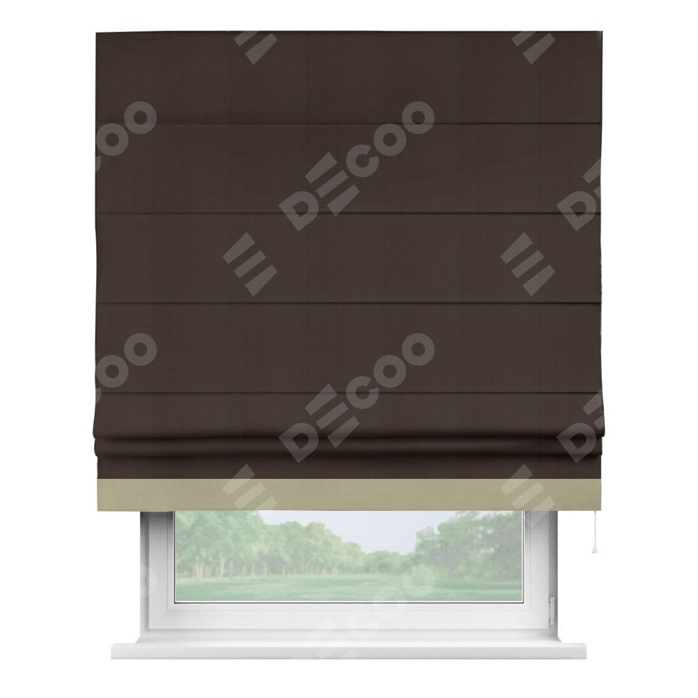 Римская штора производителя «Cortin», используется для проёма, пошита из ткани блэкаут однотонный тёмно-коричневый, артикул ткани 88287. Отделка шторы кантом «Джестер», ткань для канта используется из блэкаута однотонного разной расцветки на выбор. Имеет универсальный механизм и подходит для монтажа: на потолок, на стену и в нишу.