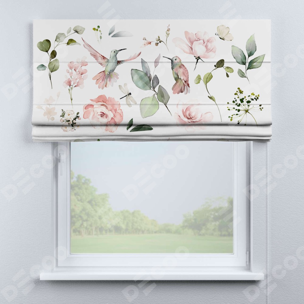 Римская штора производителя «Cortin», используется для проёма, пошита из ткани блэкаут с нанесением сублимационной печати «Уютный сад». Имеет универсальный механизм и подходит для монтажа: на потолок, на стену и в нишу.