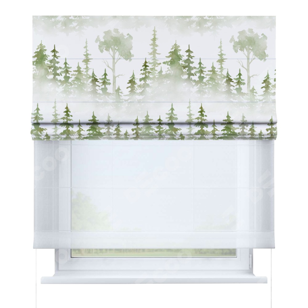 Римская штора день-ночь производителя «Cortin», используется для проёма, пошита из двух полотен, с лицевой блэкаут с нанесением сублимационной печати «Туманный лес», вторая ткань тюль (по стандарту комплектуется тюль белого цвета артикул V-01). Имеет универсальный механизм и подходит для монтажа: на потолок, на стену и в нишу.