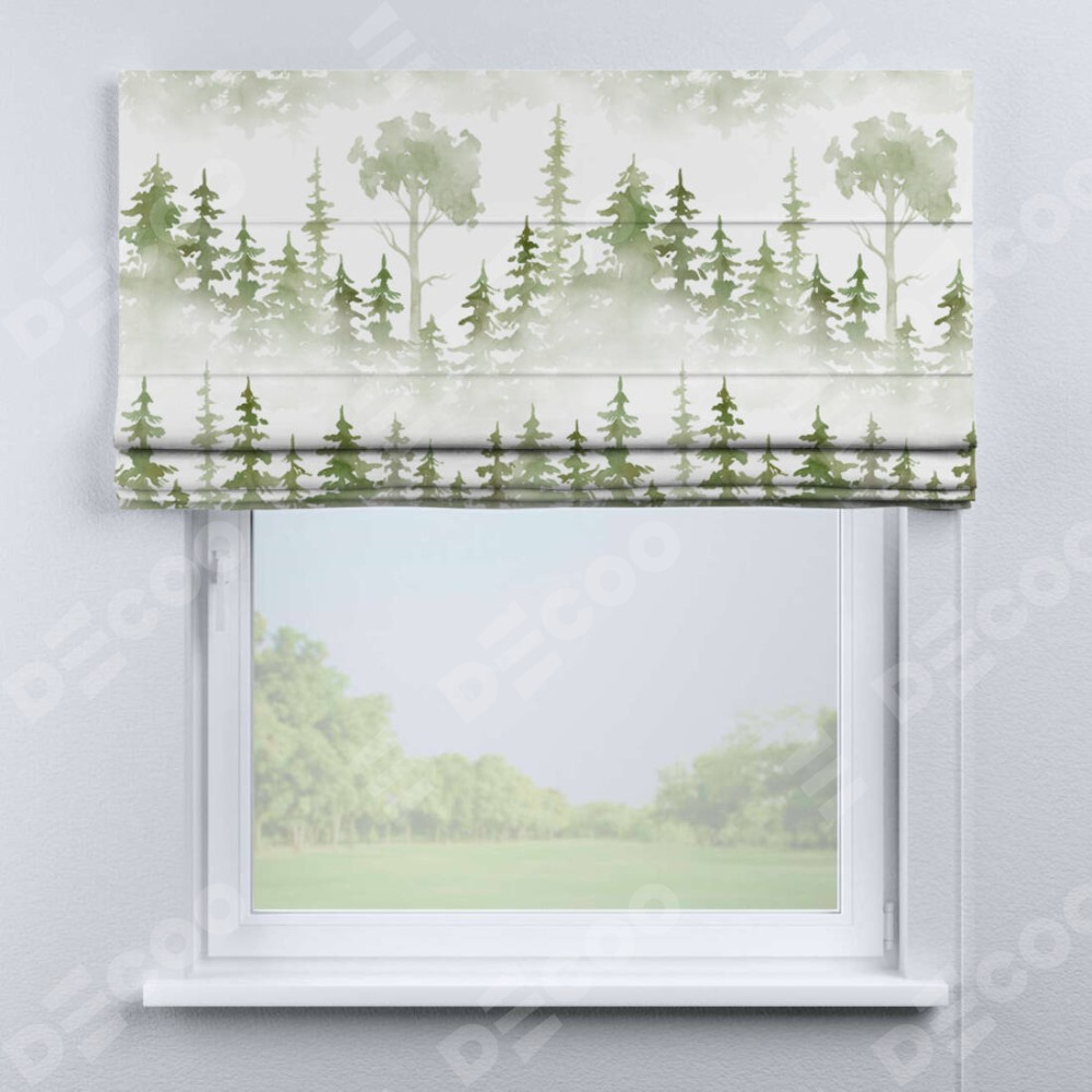 Римская штора производителя «Cortin», используется для проёма, пошита из ткани блэкаут с нанесением сублимационной печати «Туманный лес». Имеет универсальный механизм и подходит для монтажа: на потолок, на стену и в нишу.