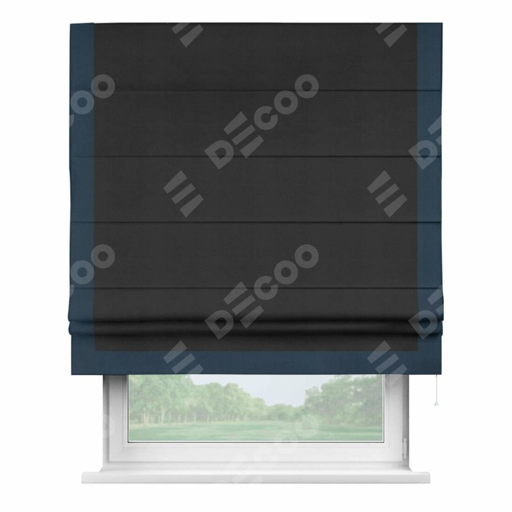 Римская штора производителя «Cortin», используется для проёма, пошита из ткани блэкаут однотонный черный, артикул ткани 79904. Отделка шторы кантом «Виктория», ткань для канта используется из блэкаута однотонного разной расцветки на выбор. Имеет универсальный механизм и подходит для монтажа: на потолок, на стену и в нишу.