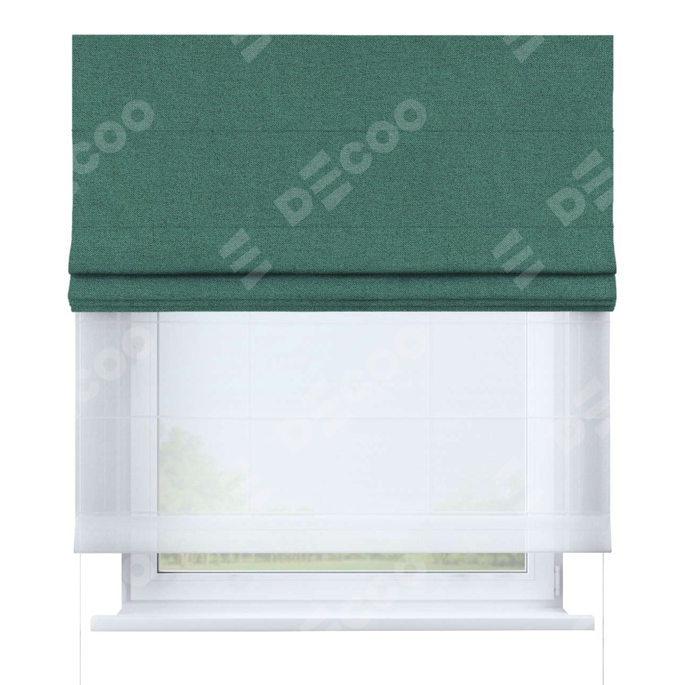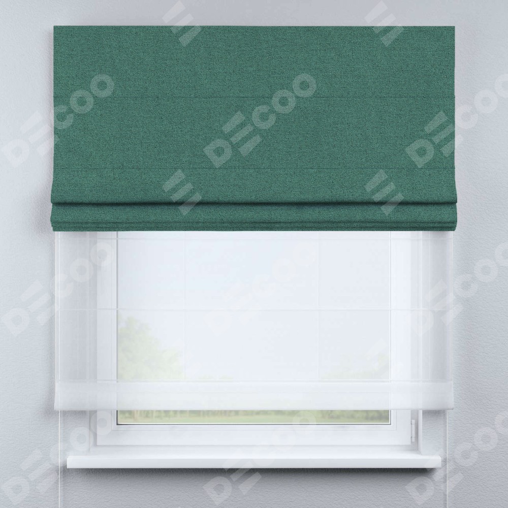 Римская штора день-ночь производителя «Cortin», используется для проёма, пошита из двух полотен, с лицевой стороны лён блэкаут бирюзовый артикул 69517, вторая ткань тюль (по стандарту комплектуется тюль белого цвета артикул V-01). Имеет универсальный механизм и подходит для монтажа: на потолок, на стену и в нишу.
