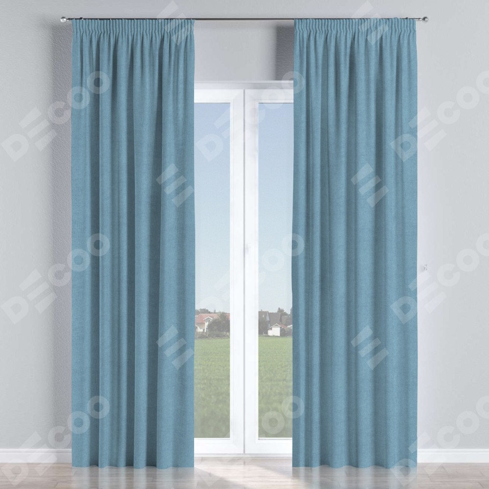 Комплект прямых штор, от производителя «Cortin», пошиты из ткани лён блэкаут голубой, артикул ткани 69574. С изнаночной стороны в верхней части штор пристрачивается шторная лента с декоративными складками «Карандаш». Для создания элегантных складок прямые шторы шьются по стандарту с коэффициентом 1:2 (на 100 см. ширины проёма 200 см. ширины ткани).