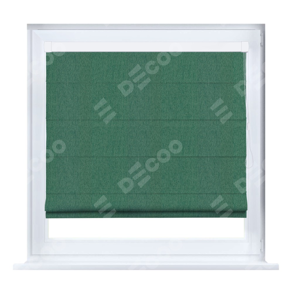 Римская штора кассетного типа, производителя «Cortin», устанавливается только на пластиковые окна и прилегает к стеклопакету, пошита из ткани твид блэкаут зелёный, артикул 21589.