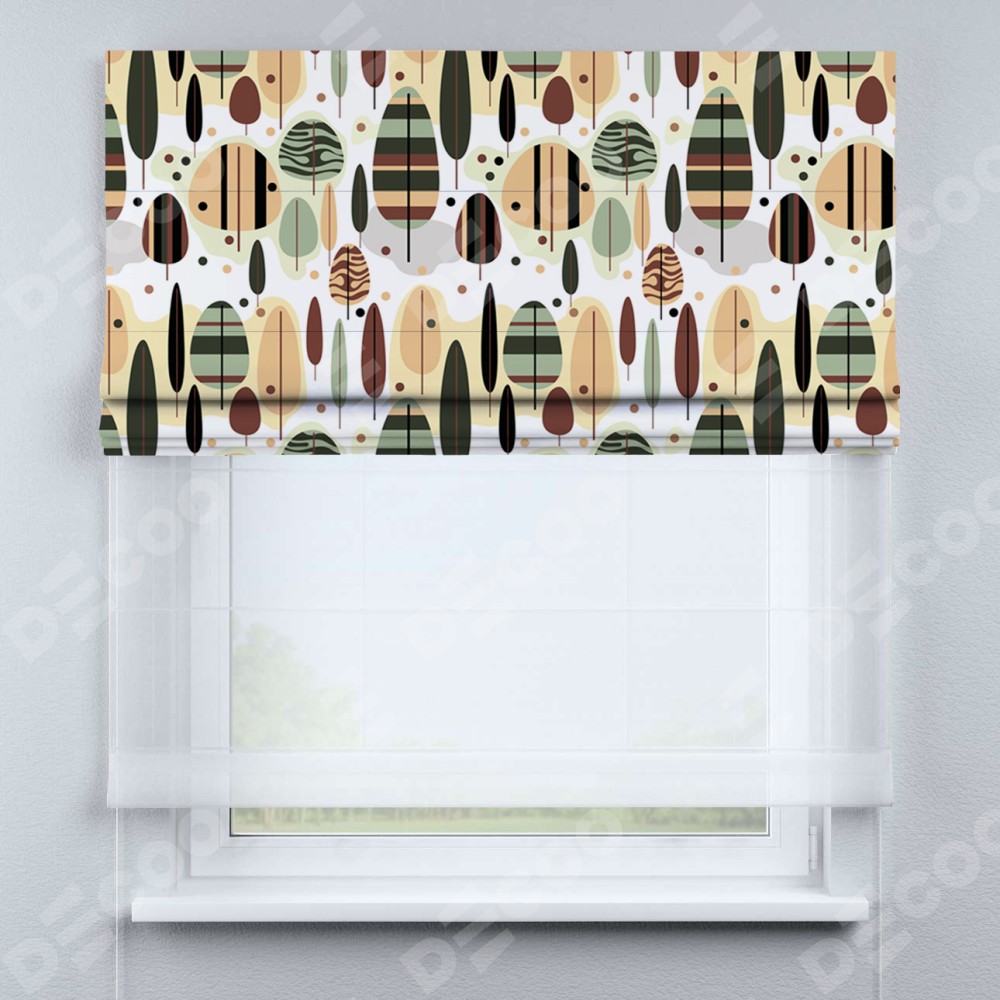 Римская штора день-ночь производителя «Cortin», используется для проёма, пошита из двух полотен, с лицевой блэкаут с нанесением сублимационной печати «Деревья в полоску», вторая ткань тюль (по стандарту комплектуется тюль белого цвета артикул V-01). Имеет универсальный механизм и подходит для монтажа: на потолок, на стену и в нишу.
