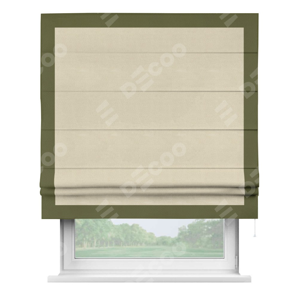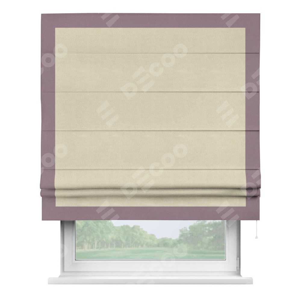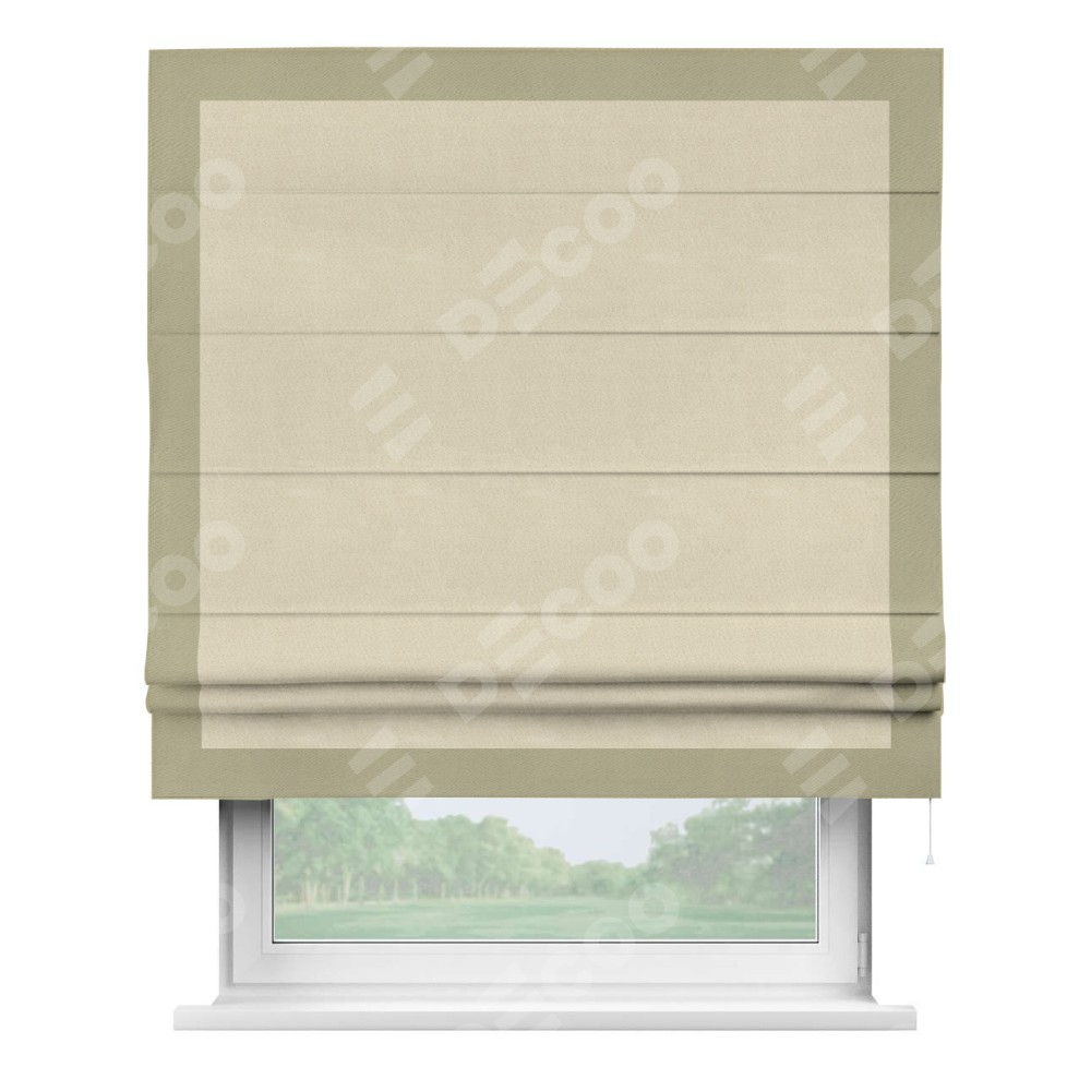 Римская штора производителя «Cortin», используется для проёма, пошита из ткани блэкаут однотонный бежевый, артикул ткани 13125. Отделка шторы кантом «Чесс», ткань для канта используется из блэкаута однотонного разной расцветки на выбор. Имеет универсальный механизм и подходит для монтажа: на потолок, на стену и в нишу.