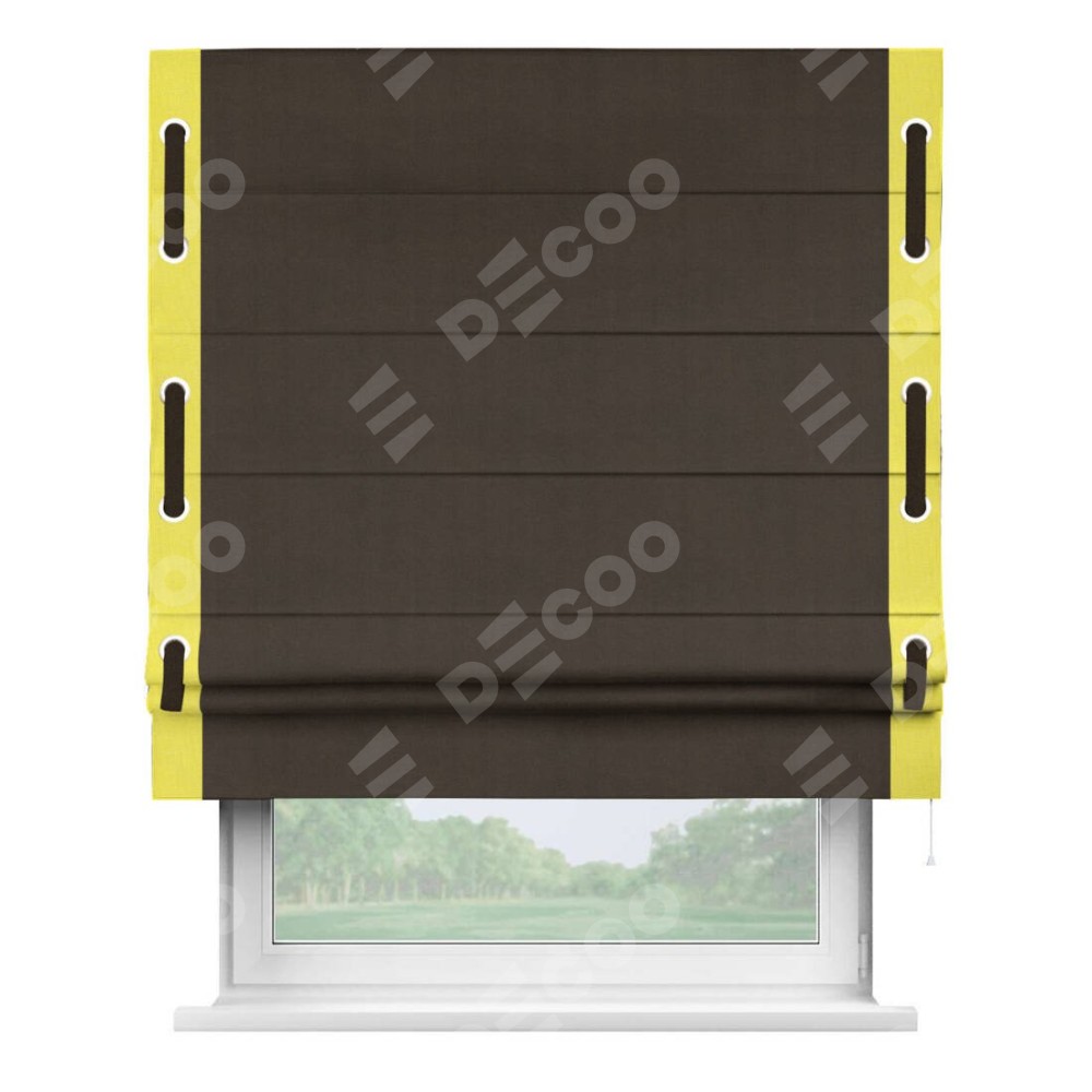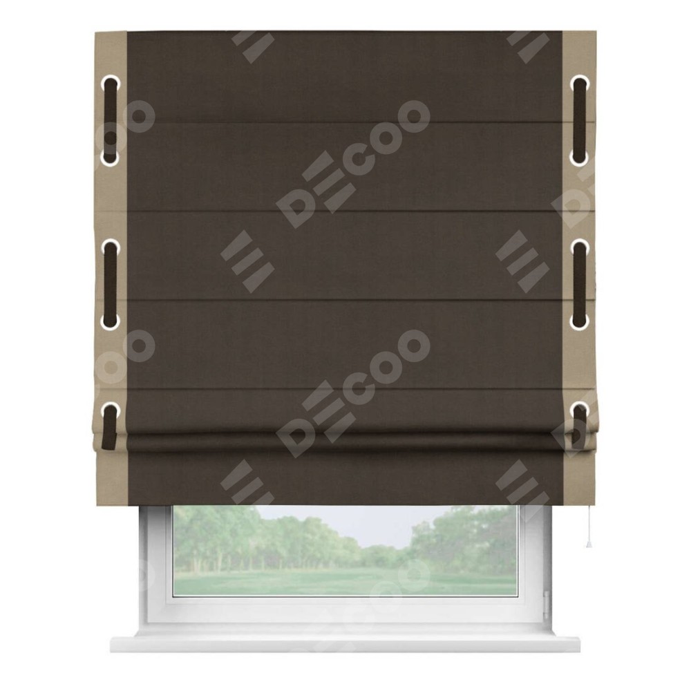 Римская штора производителя «Cortin», используется для проёма, пошита из ткани вельвет тёмно-коричневый, артикул ткани 30991. Отделка шторы кантом «Стрим Дуо» на кантах расположены люверсы с пояском, ткань для канта используется из вельвета разной расцветки на выбор. Ткань для пояска обычно используется из основной ткани шторы, а так же можно сделать из любой расцветки по желанию. Имеет универсальный механизм и подходит для монтажа: на потолок, на стену и в нишу.