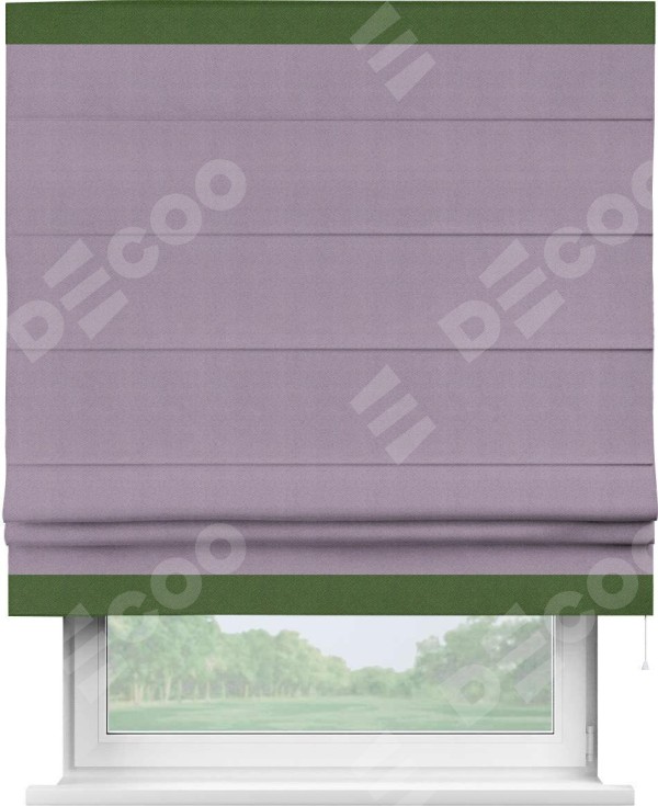 Римская штора производителя «Cortin», используется для проёма, пошита из ткани блэкаут однотонный светло-сиреневый, артикул ткани 29333−1. Отделка шторы кантом «Горизонт», ткань для канта используется из блэкаута однотонного разной расцветки на выбор. Имеет универсальный механизм и подходит для монтажа: на потолок, на стену и в нишу.