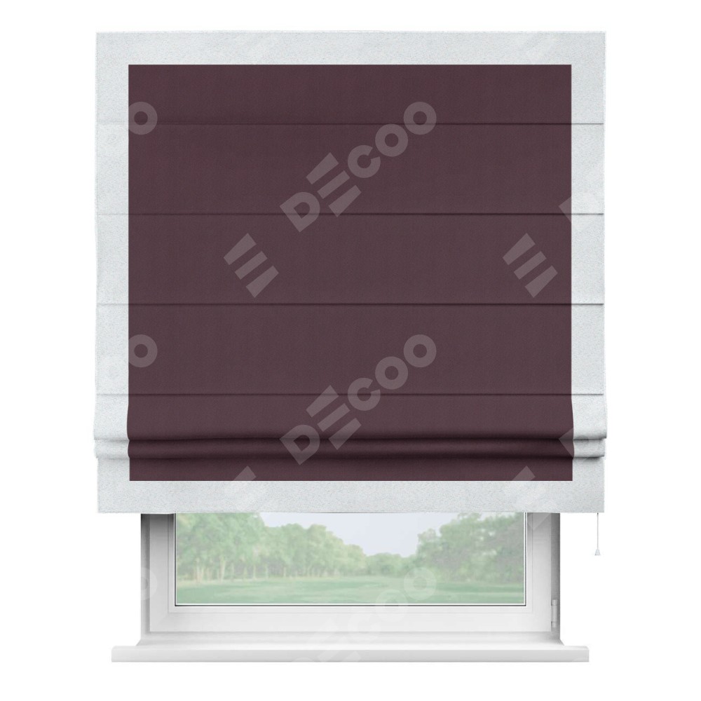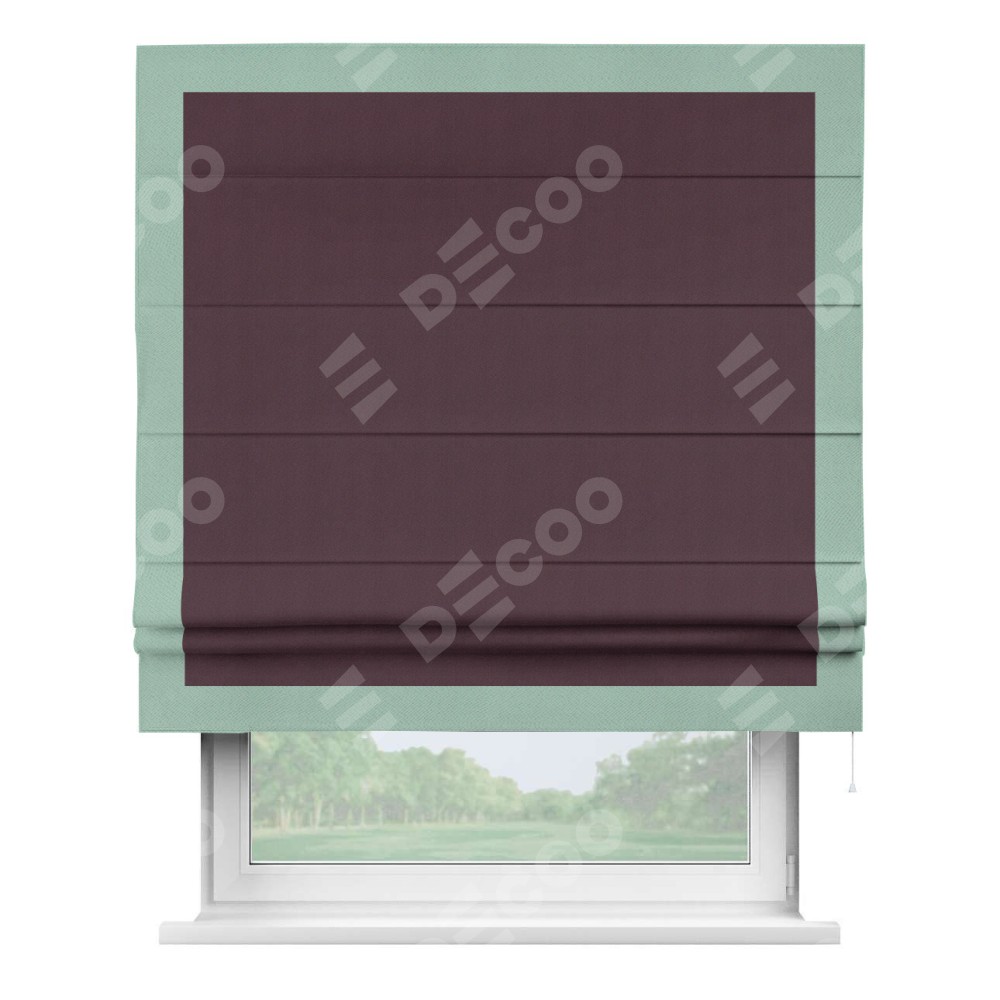 Римская штора производителя «Cortin», используется для проёма, пошита из ткани блэкаут однотонный сиреневый, артикул ткани 29333−2. Отделка шторы кантом «Чесс», ткань для канта используется из блэкаута однотонного разной расцветки на выбор. Имеет универсальный механизм и подходит для монтажа: на потолок, на стену и в нишу.