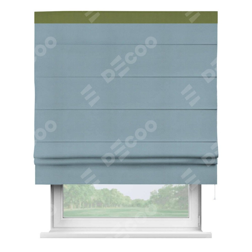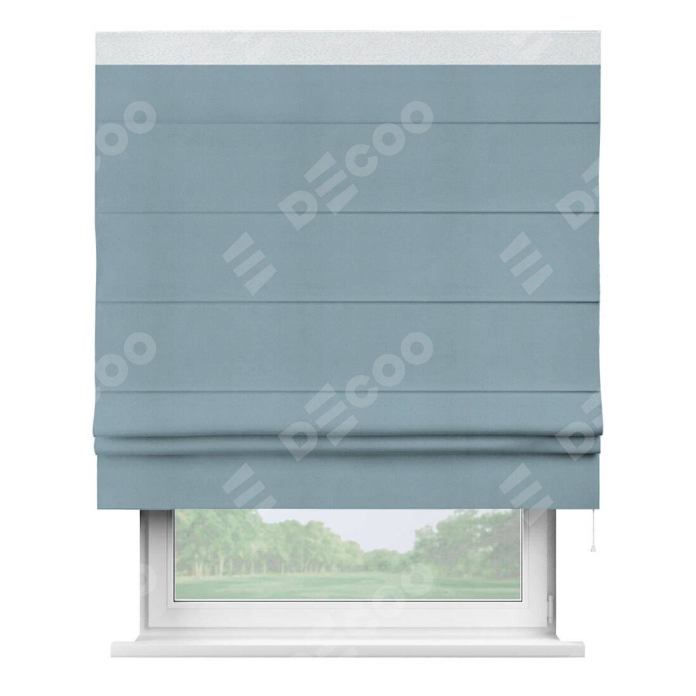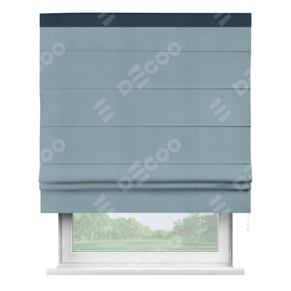 Римская штора производителя «Cortin», используется для проёма, пошита из ткани блэкаут однотонный серо-голубой, артикул ткани 29327−2. Отделка шторы кантом «Кинг», ткань для канта используется из блэкаута однотонного разной расцветки на выбор. Имеет универсальный механизм и подходит для монтажа: на потолок, на стену и в нишу.
