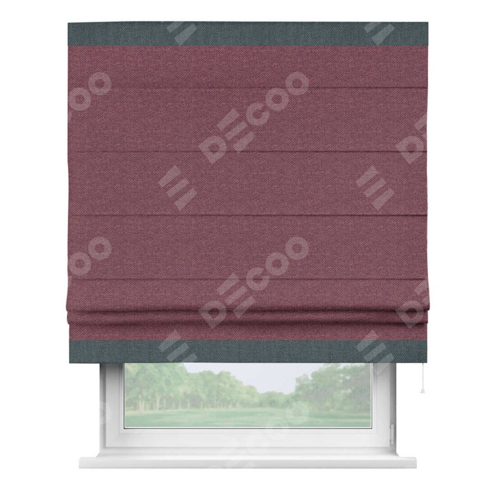 Римская штора производителя «Cortin», используется для проёма, пошита из ткани лён димаут марсала, артикул 1602. Отделка шторы кантом «Горизонт», ткань для канта используется из льна димаут разной расцветки на выбор. Имеет универсальный механизм и подходит для монтажа: на потолок, на стену и в нишу.