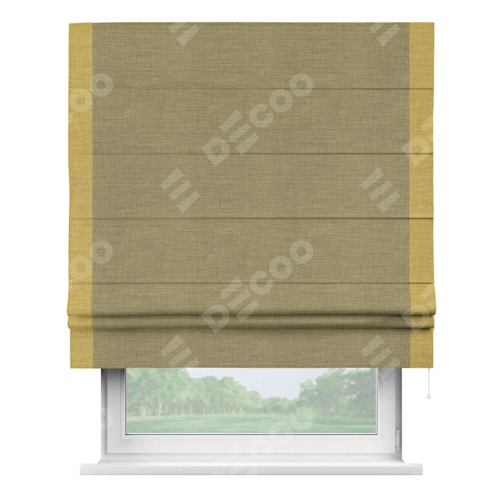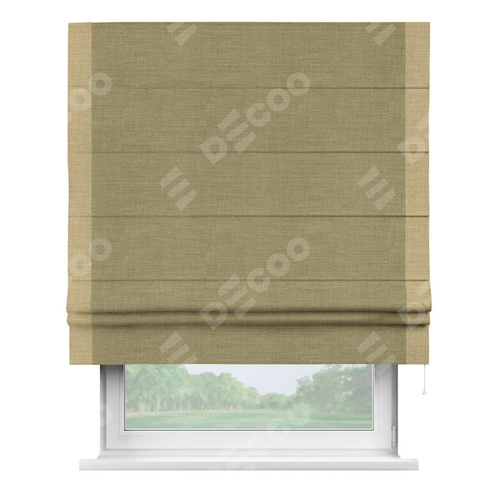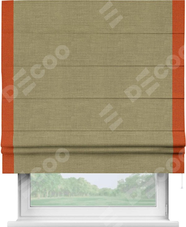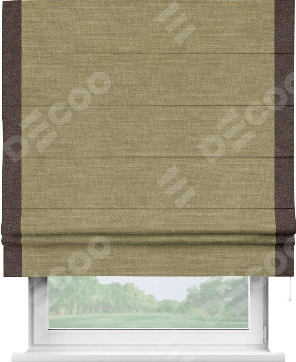 Римская штора производителя «Cortin», используется для проёма, пошита из ткани лён коричневый, артикул 7443. Отделка шторы кантом «Стрим Дуо», ткань для канта используется из льна разной расцветки на выбор. Имеет универсальный механизм и подходит для монтажа: на потолок, на стену и в нишу.