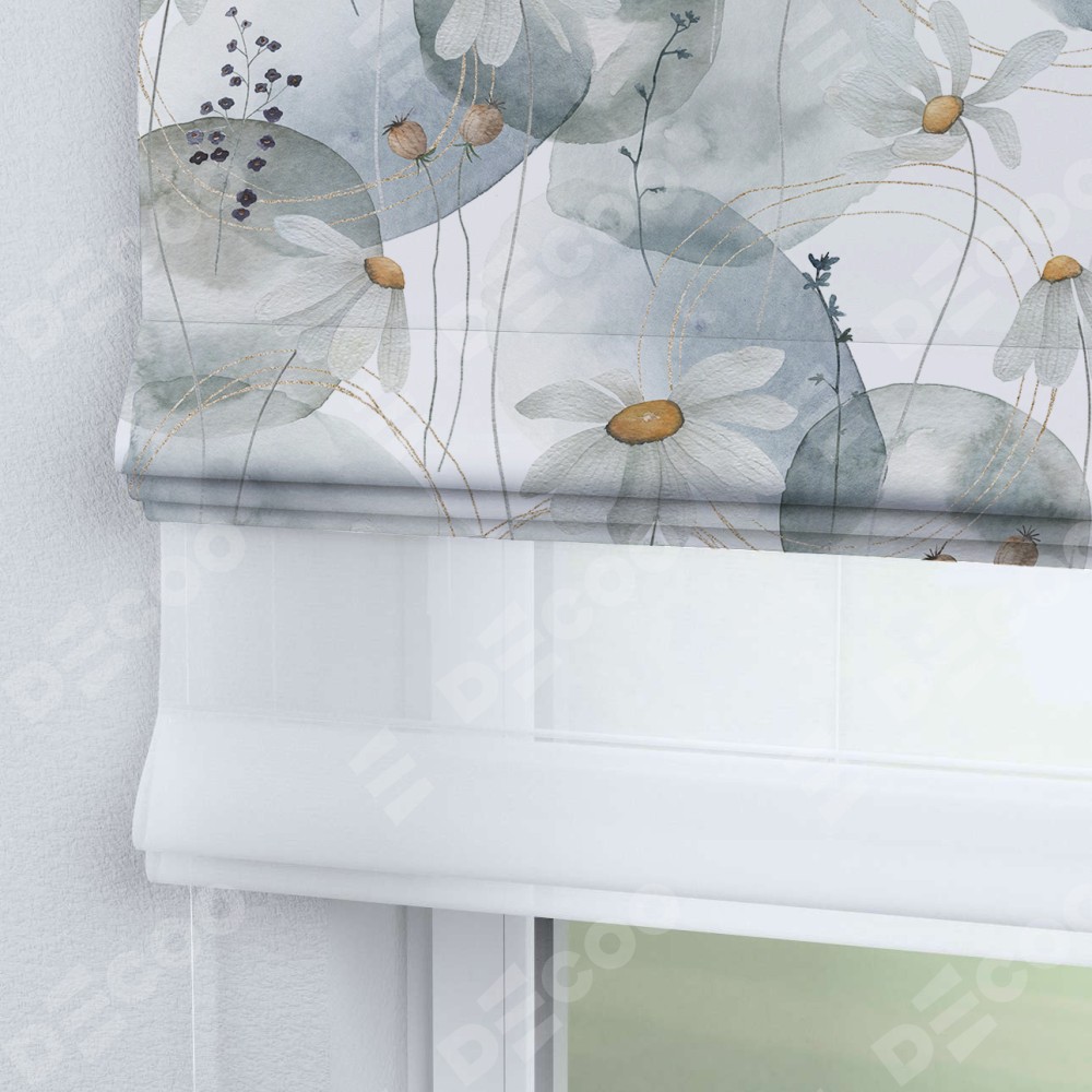 Римская штора день-ночь производителя «Cortin», используется для проёма, пошита из двух полотен, с лицевой блэкаут с нанесением сублимационной печати «Ромашки акварель», вторая ткань тюль (по стандарту комплектуется тюль белого цвета артикул V-01). Имеет универсальный механизм и подходит для монтажа: на потолок, на стену и в нишу.