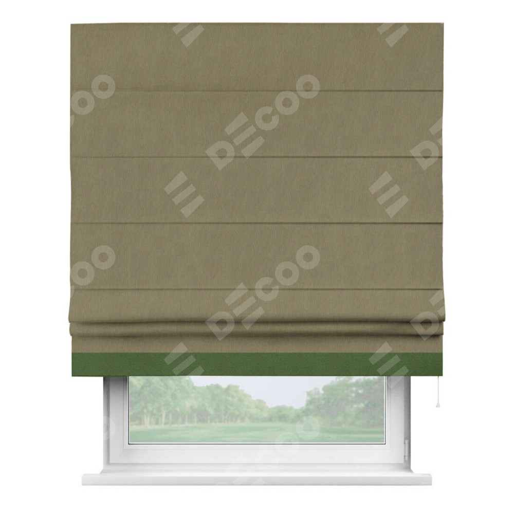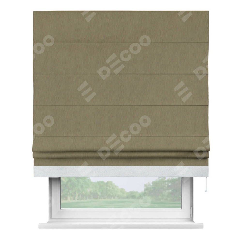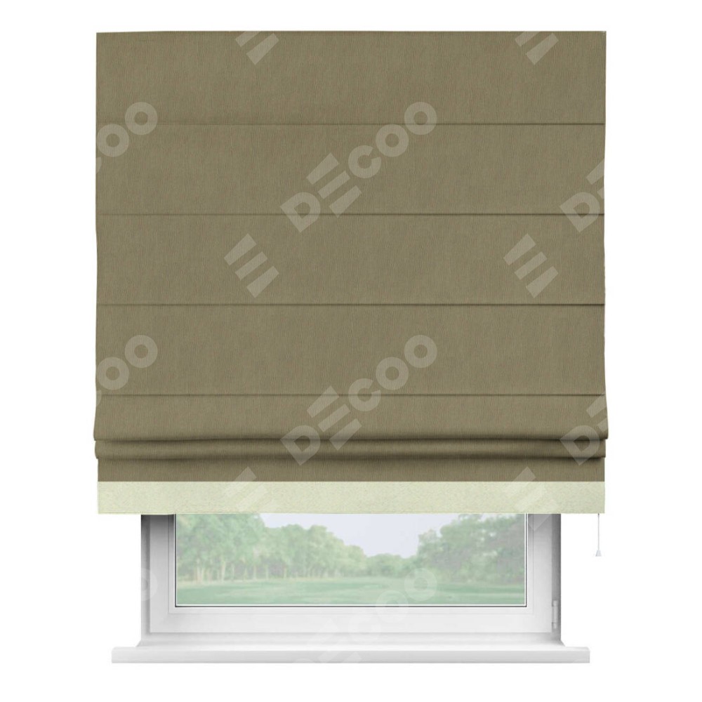 Римская штора производителя «Cortin», используется для проёма, пошита из ткани блэкаут однотонный бежево-золотой, артикул ткани 12095−2. Отделка шторы кантом «Джестер», ткань для канта используется из блэкаута однотонного разной расцветки на выбор. Имеет универсальный механизм и подходит для монтажа: на потолок, на стену и в нишу.