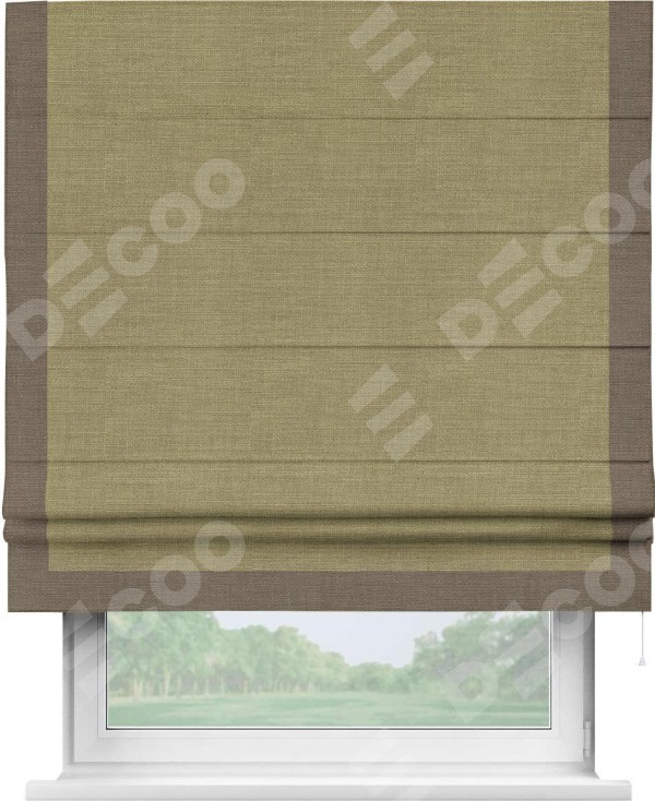 Римская штора производителя «Cortin», используется для проёма, пошита из ткани лён коричневый, артикул 7443. Отделка шторы кантом «Виктория», ткань для канта используется из льна разной расцветки на выбор. Имеет универсальный механизм и подходит для монтажа: на потолок, на стену и в нишу.