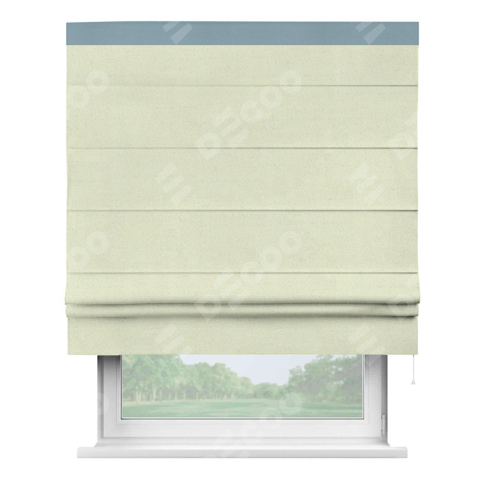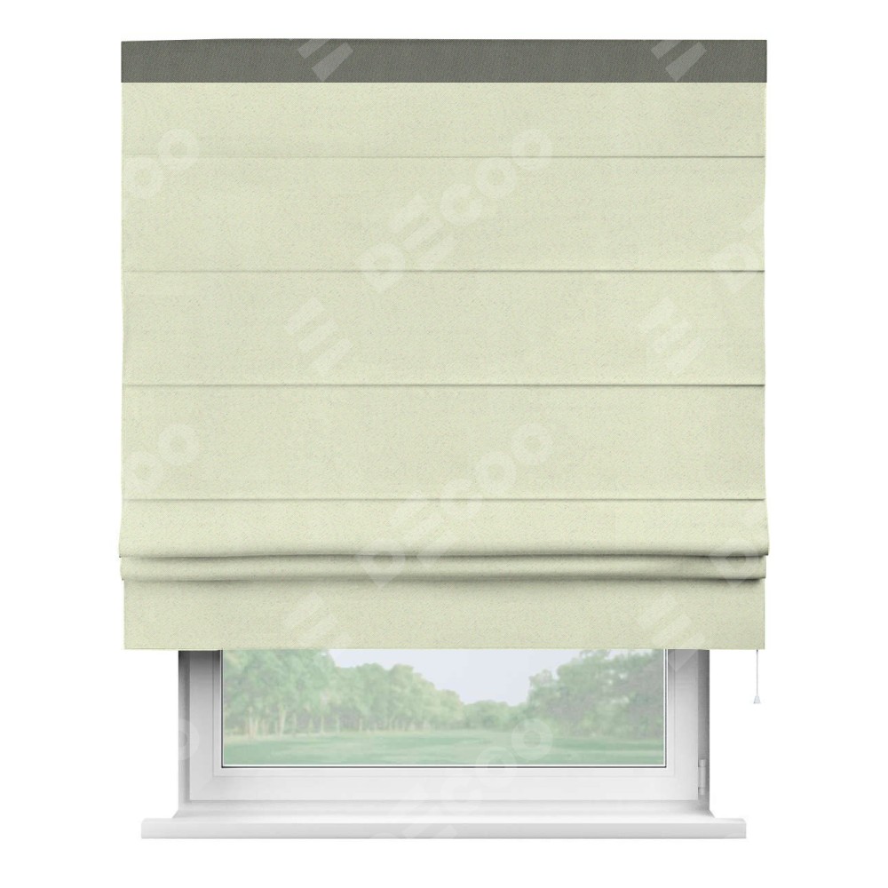 Римская штора производителя «Cortin», используется для проёма, пошита из ткани блэкаут однотонный сливочный, артикул ткани 6668−02. Отделка шторы кантом «Кинг», ткань для канта используется из блэкаута однотонного разной расцветки на выбор. Имеет универсальный механизм и подходит для монтажа: на потолок, на стену и в нишу.