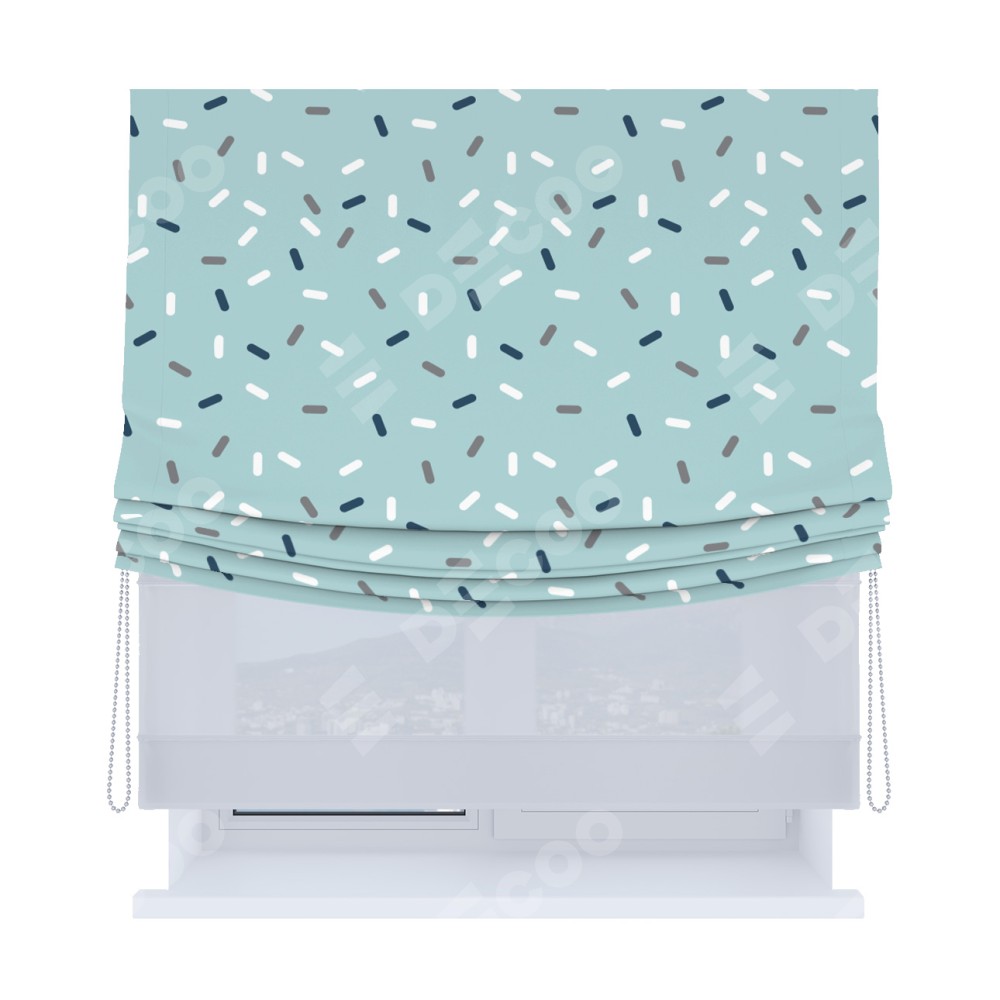 Римская штора день-ночь производителя «Cortin», используется для проёма, пошита из двух полотен, с лицевой блэкаут с нанесением сублимационной печати «Короткие линии», вторая ткань тюль (по стандарту комплектуется тюль белого цвета артикул V-01). Имеет универсальный механизм и подходит для монтажа: на потолок, на стену и в нишу. Удобное управление каждой шторой отдельно.