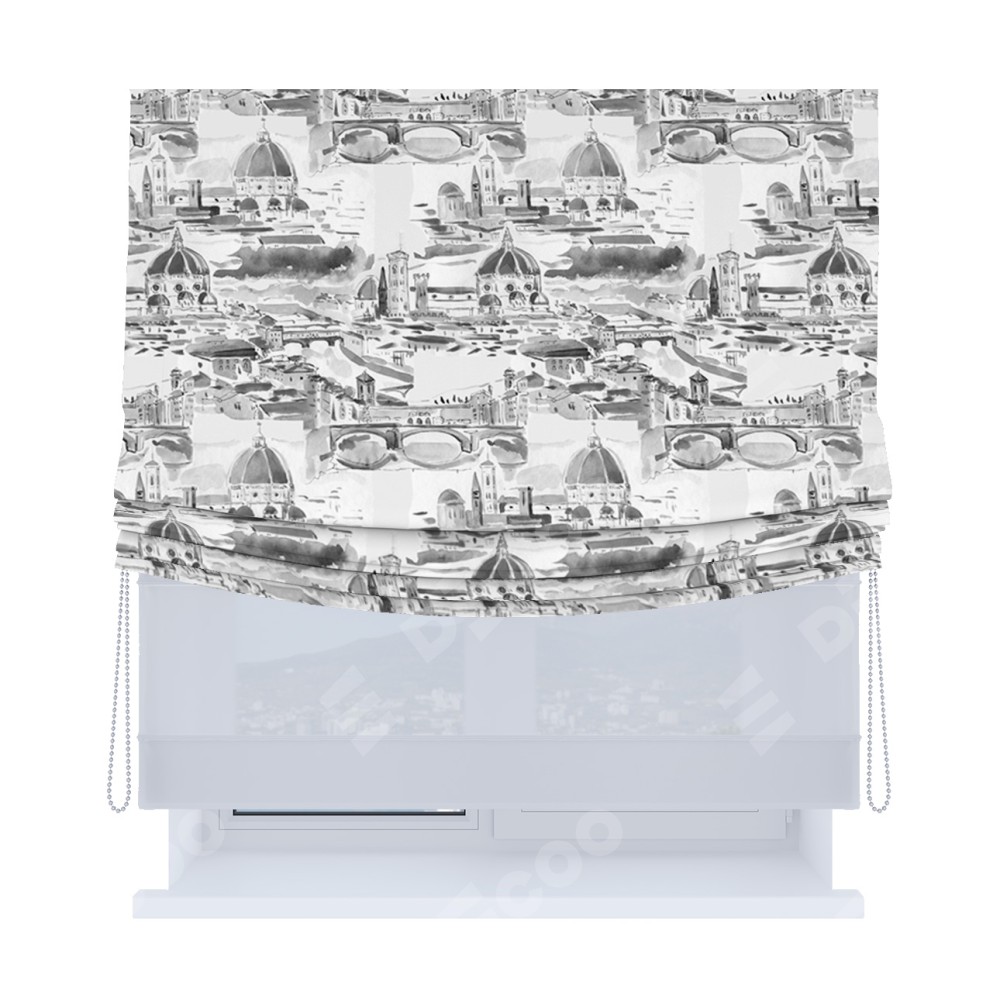 Римская штора день-ночь производителя «Cortin», используется для проёма, пошита из двух полотен, с лицевой блэкаут с нанесением сублимационной печати «Старый город», вторая ткань тюль (по стандарту комплектуется тюль белого цвета артикул V-01). Имеет универсальный механизм и подходит для монтажа: на потолок, на стену и в нишу. Удобное управление каждой шторой отдельно.