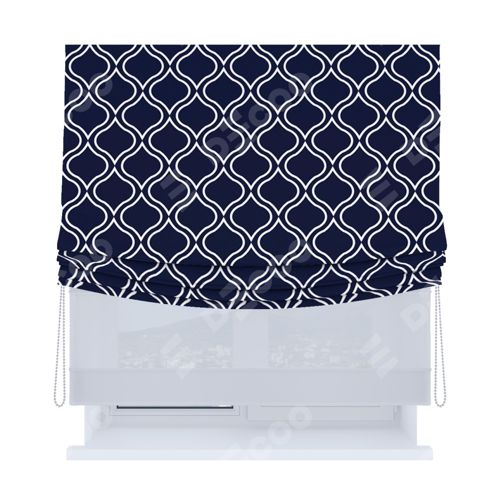 Римская штора день-ночь производителя «Cortin», используется для проёма, пошита из двух полотен, с лицевой блэкаут с нанесением сублимационной печати «Тайны востока синий», вторая ткань тюль (по стандарту комплектуется тюль белого цвета артикул V-01). Имеет универсальный механизм и подходит для монтажа: на потолок, на стену и в нишу. Удобное управление каждой шторой отдельно.