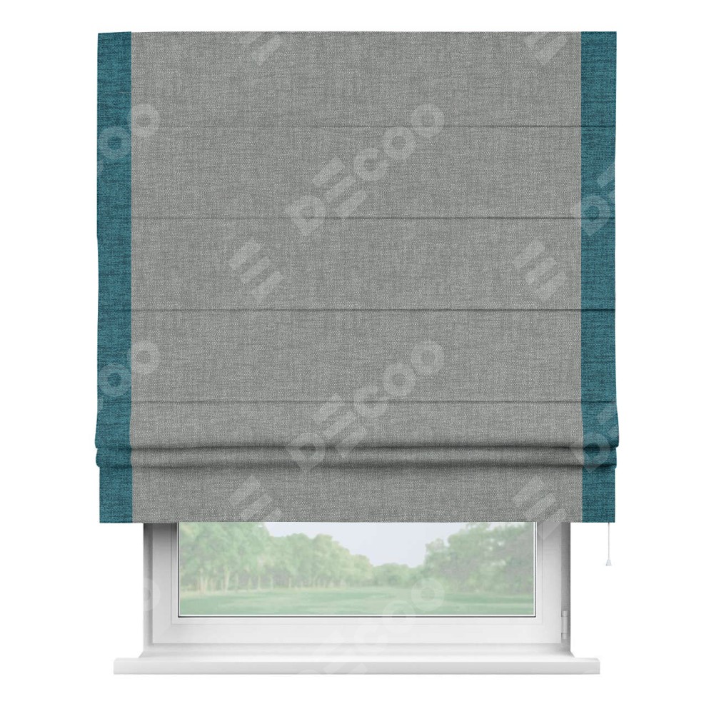 Римская штора производителя «Cortin», используется для проёма, пошита из ткани рогожка димаут тёмно-серый, артикул 80418. Отделка шторы кантом «Стрим Дуо», ткань для канта используется из рогожки димаут разной расцветки на выбор. Имеет универсальный механизм и подходит для монтажа: на потолок, на стену и в нишу.