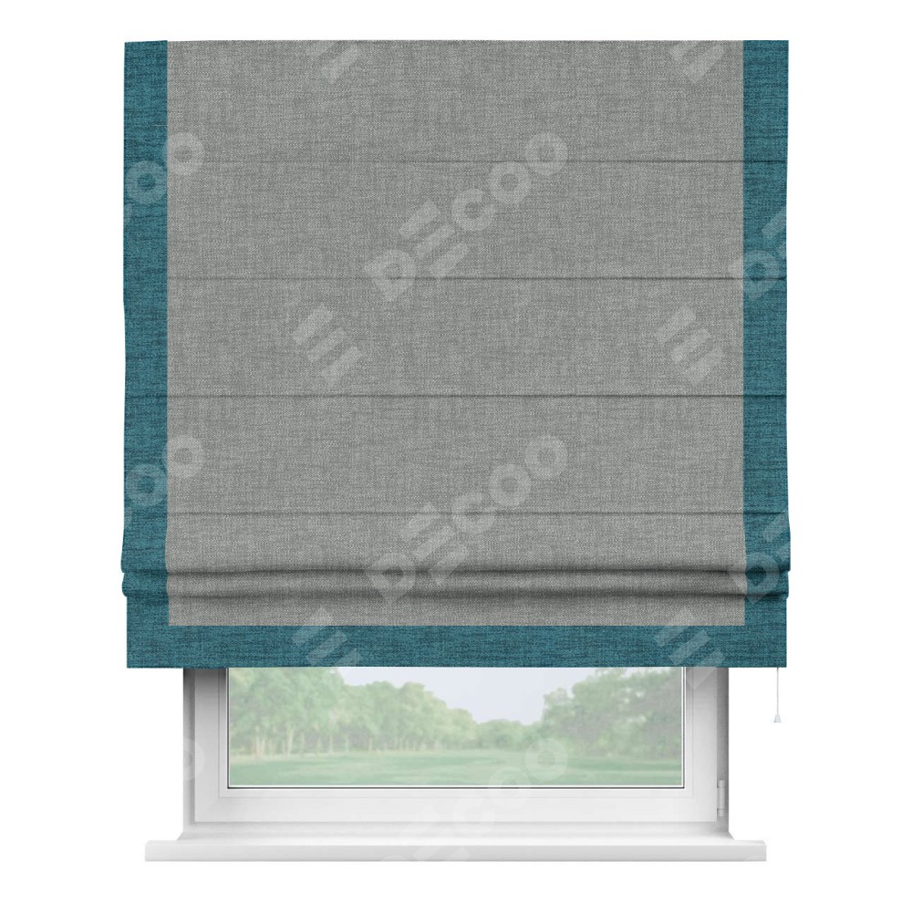Римская штора производителя «Cortin», используется для проёма, пошита из ткани рогожка димаут тёмно-серый, артикул 80418. Отделка шторы кантом «Виктория», ткань для канта используется из рогожки димаут разной расцветки на выбор. Имеет универсальный механизм и подходит для монтажа: на потолок, на стену и в нишу.