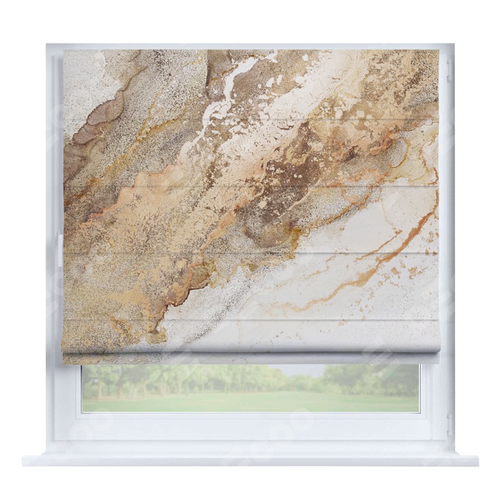 Римская штора производителя «Cortin», устанавливается на створку окна, пошита из ткани блэкаут с нанесением сублимационной печати «Бежево-золотой мрамор». Штора шьётся по индивидуальным размерам, для данного типа римской шторы возможная ширина от 35 до 150 см., высота до 250 см.