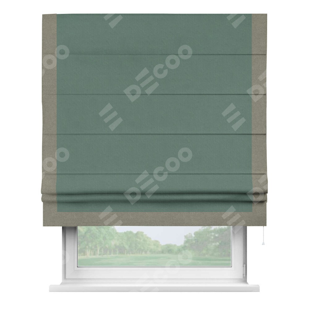 Римская штора производителя «Cortin», используется для проёма, пошита из ткани лён блэкаут бирюзовый, артикул 69517. Отделка шторы кантом «Виктория», ткань для канта используется из льна разной расцветки на выбор. Имеет универсальный механизм и подходит для монтажа: на потолок, на стену и в нишу.