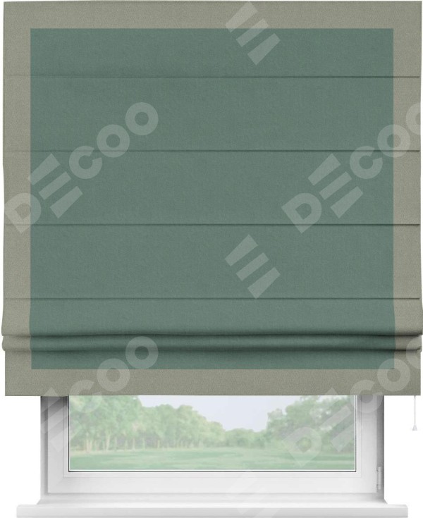 Римская штора производителя «Cortin», используется для проёма, пошита из ткани лён блэкаут бирюзовый, артикул 69517. Отделка шторы кантом «Чесс», ткань для канта используется из льна разной расцветки на выбор. Имеет универсальный механизм и подходит для монтажа: на потолок, на стену и в нишу.