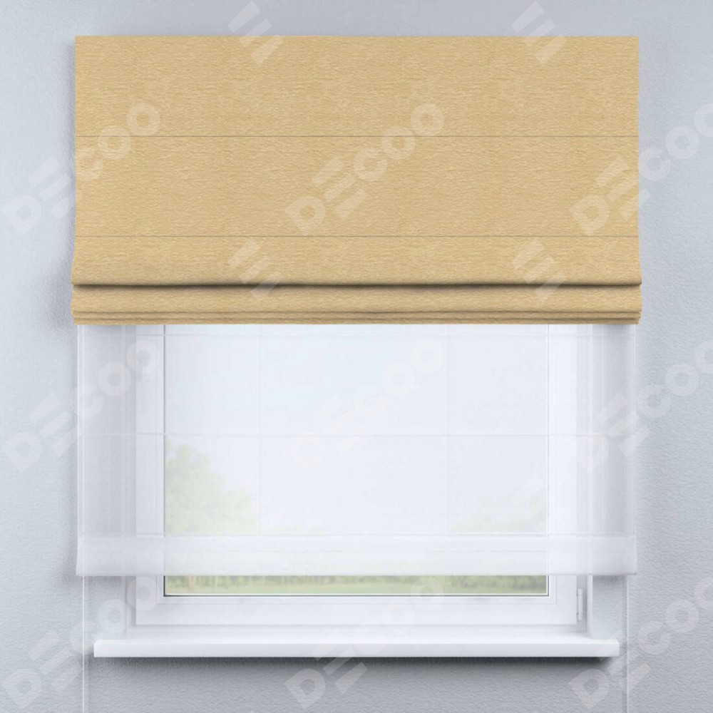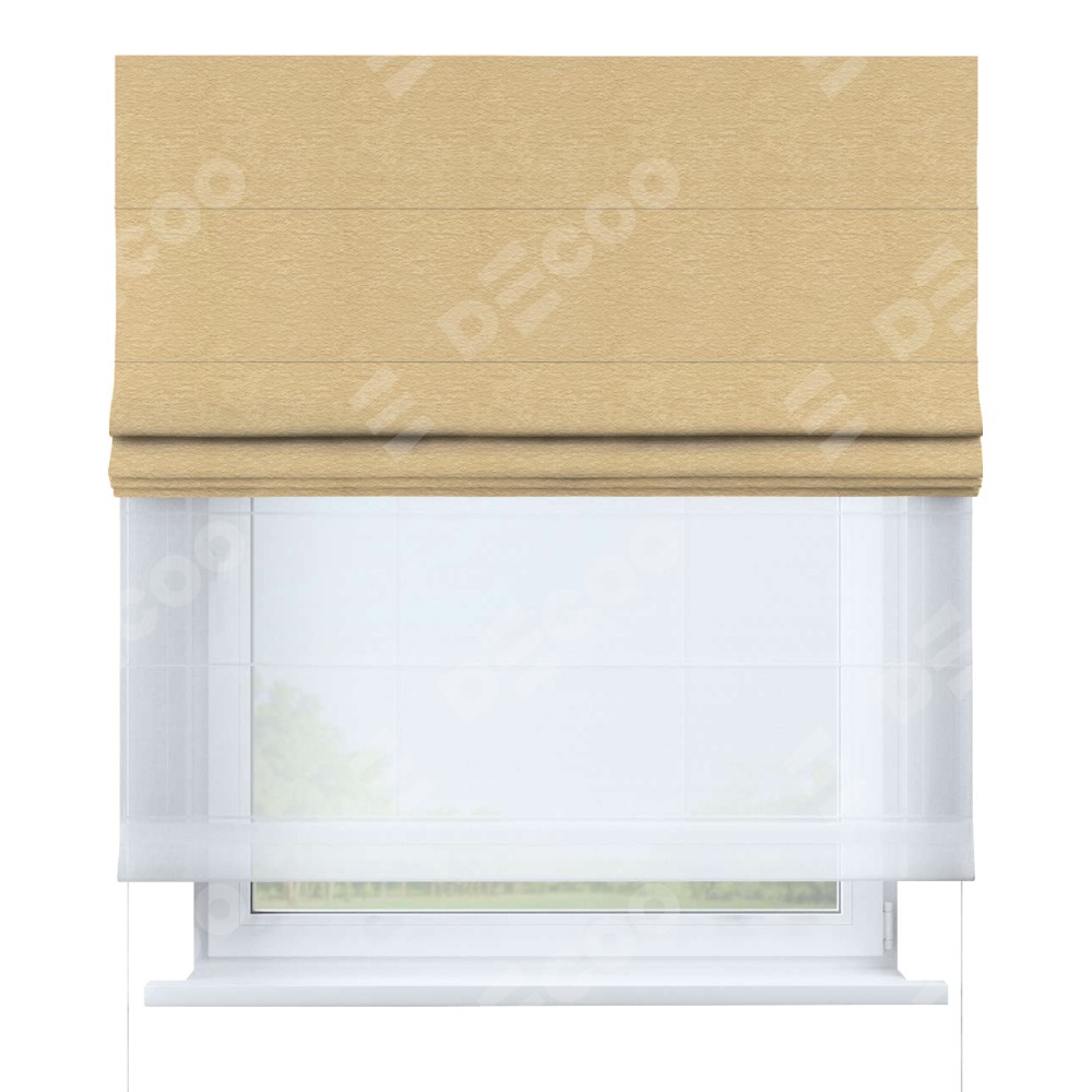 Римская штора день-ночь производителя «Cortin», используется для проёма, пошита из двух полотен, с лицевой стороны софт однотонный бежевый артикул 4202 05, вторая ткань тюль (по стандарту комплектуется тюль белого цвета артикул V-01). Имеет универсальный механизм и подходит для монтажа: на потолок, на стену и в нишу.