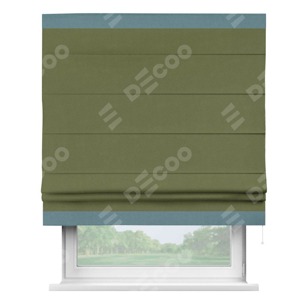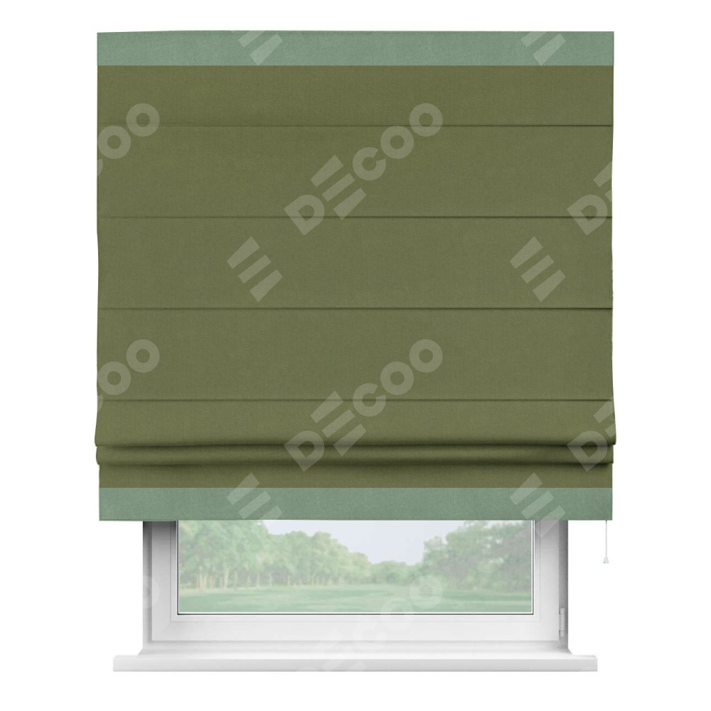 Римская штора производителя «Cortin», используется для проёма, пошита из ткани лён блэкаут оливковый, артикул 69516. Отделка шторы кантом «Горизонт», ткань для канта используется из льна разной расцветки на выбор. Имеет универсальный механизм и подходит для монтажа: на потолок, на стену и в нишу.