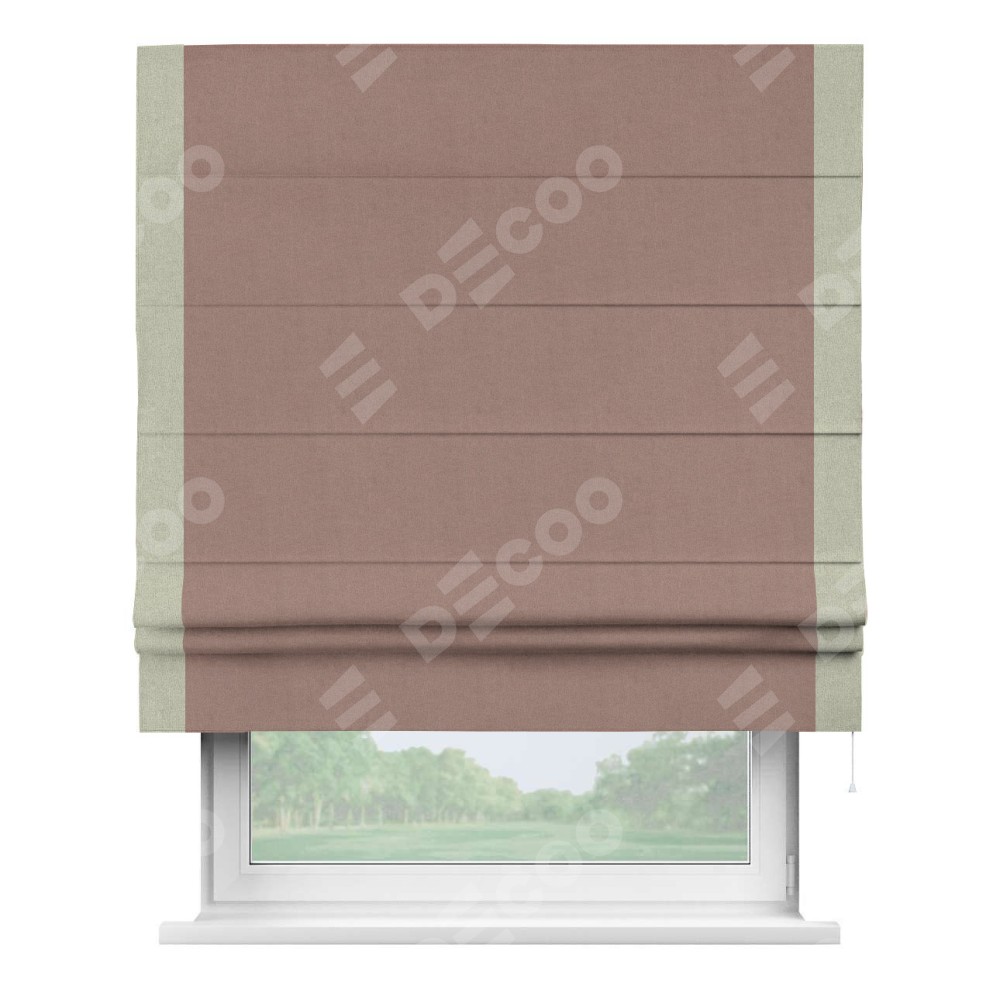 Римская штора производителя «Cortin», используется для проёма, пошита из ткани лён блэкаут розовый, артикул 69575. Отделка шторы кантом «Стрим Дуо», ткань для канта используется из льна разной расцветки на выбор. Имеет универсальный механизм и подходит для монтажа: на потолок, на стену и в нишу.