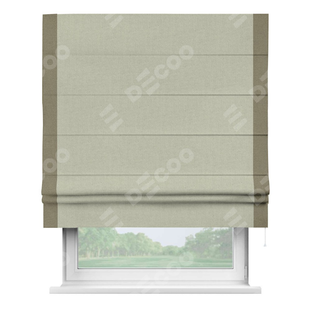 Римская штора производителя «Cortin», используется для проёма, пошита из ткани лён блэкаут серо-бежевый, артикул 69450. Отделка шторы кантом «Стрим Дуо», ткань для канта используется из льна разной расцветки на выбор. Имеет универсальный механизм и подходит для монтажа: на потолок, на стену и в нишу.