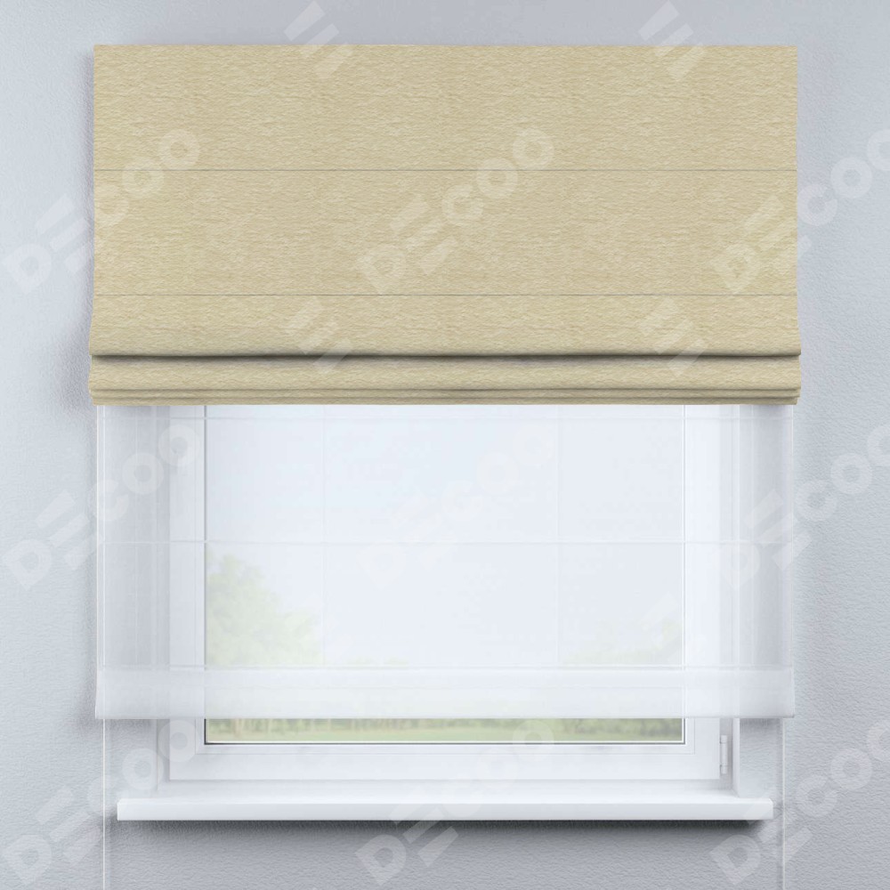 Римская штора день-ночь производителя «Cortin», используется для проёма, пошита из двух полотен, с лицевой стороны софт однотонный светло-бежевый артикул 54426, вторая ткань тюль (по стандарту комплектуется тюль белого цвета артикул V-01). Имеет универсальный механизм и подходит для монтажа: на потолок, на стену и в нишу.