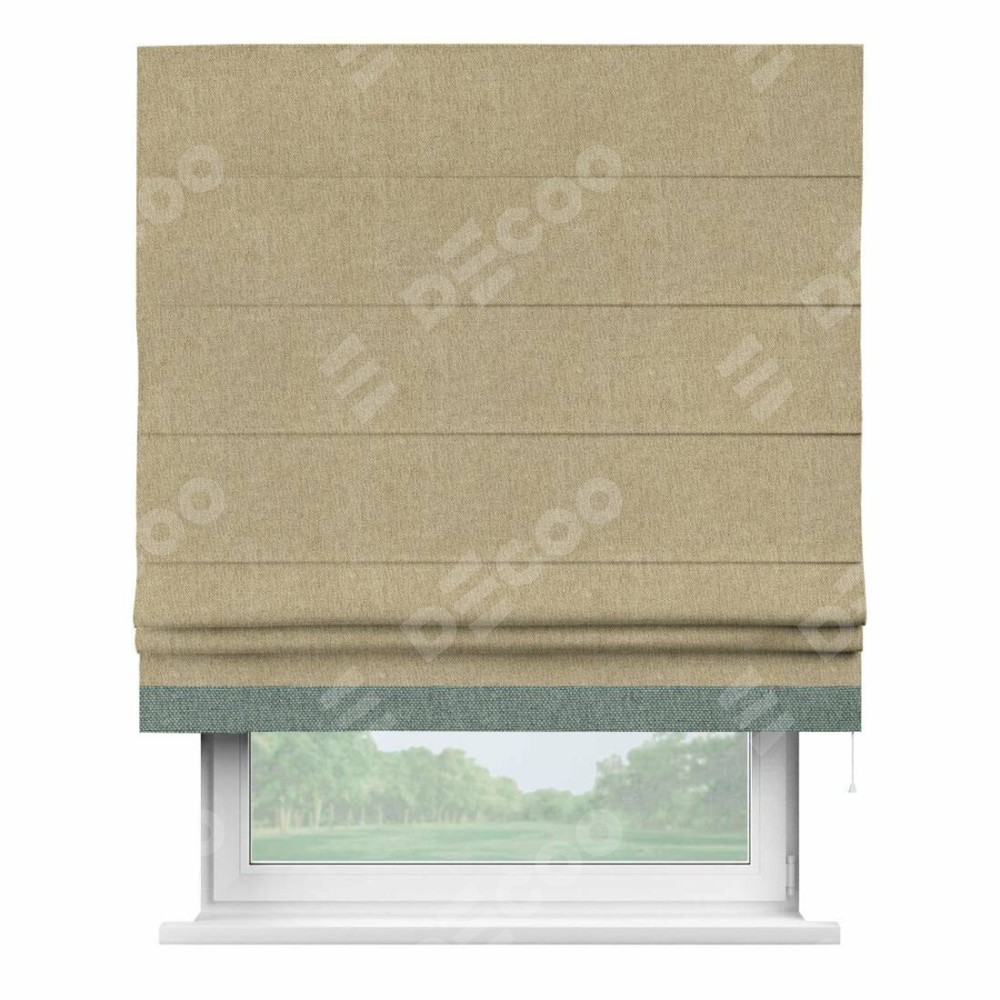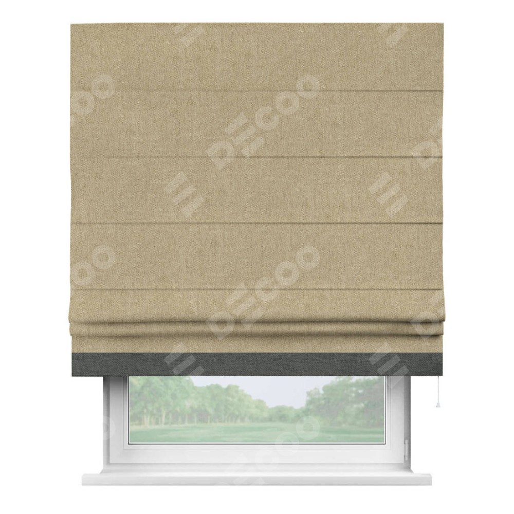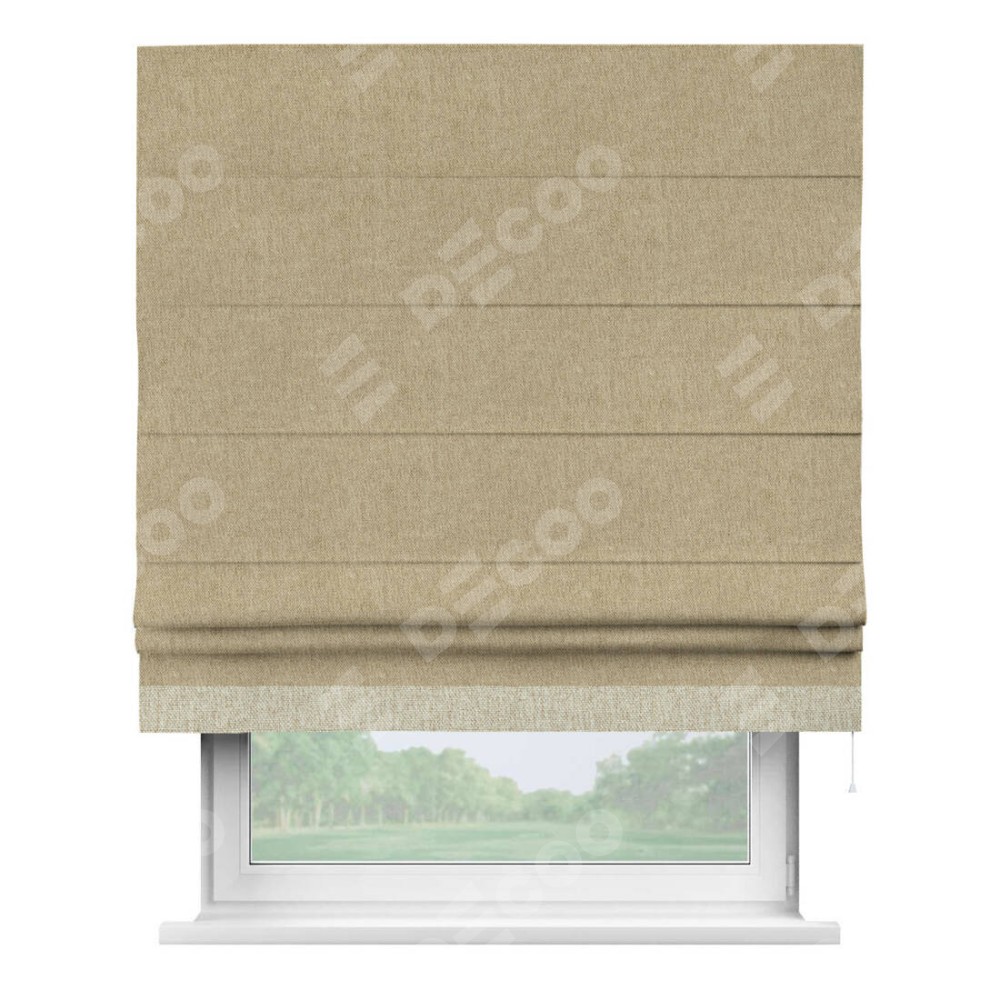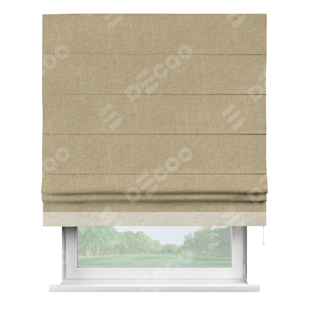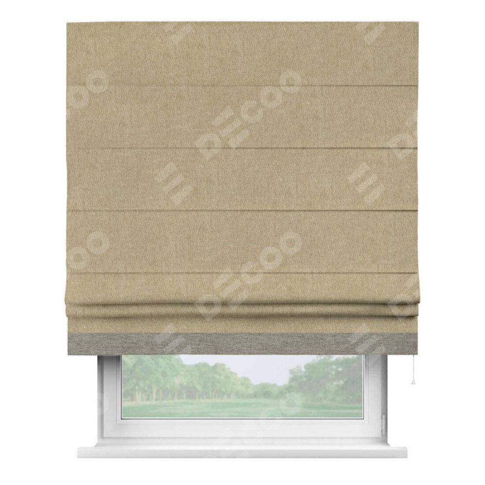 Римская штора производителя «Cortin», используется для проёма, пошита из ткани стиф димаут бежевый, артикул 18083. Отделка шторы кантом «Джестер», ткань для канта используется из стифа разной расцветки на выбор. Имеет универсальный механизм и подходит для монтажа: на потолок, на стену и в нишу.