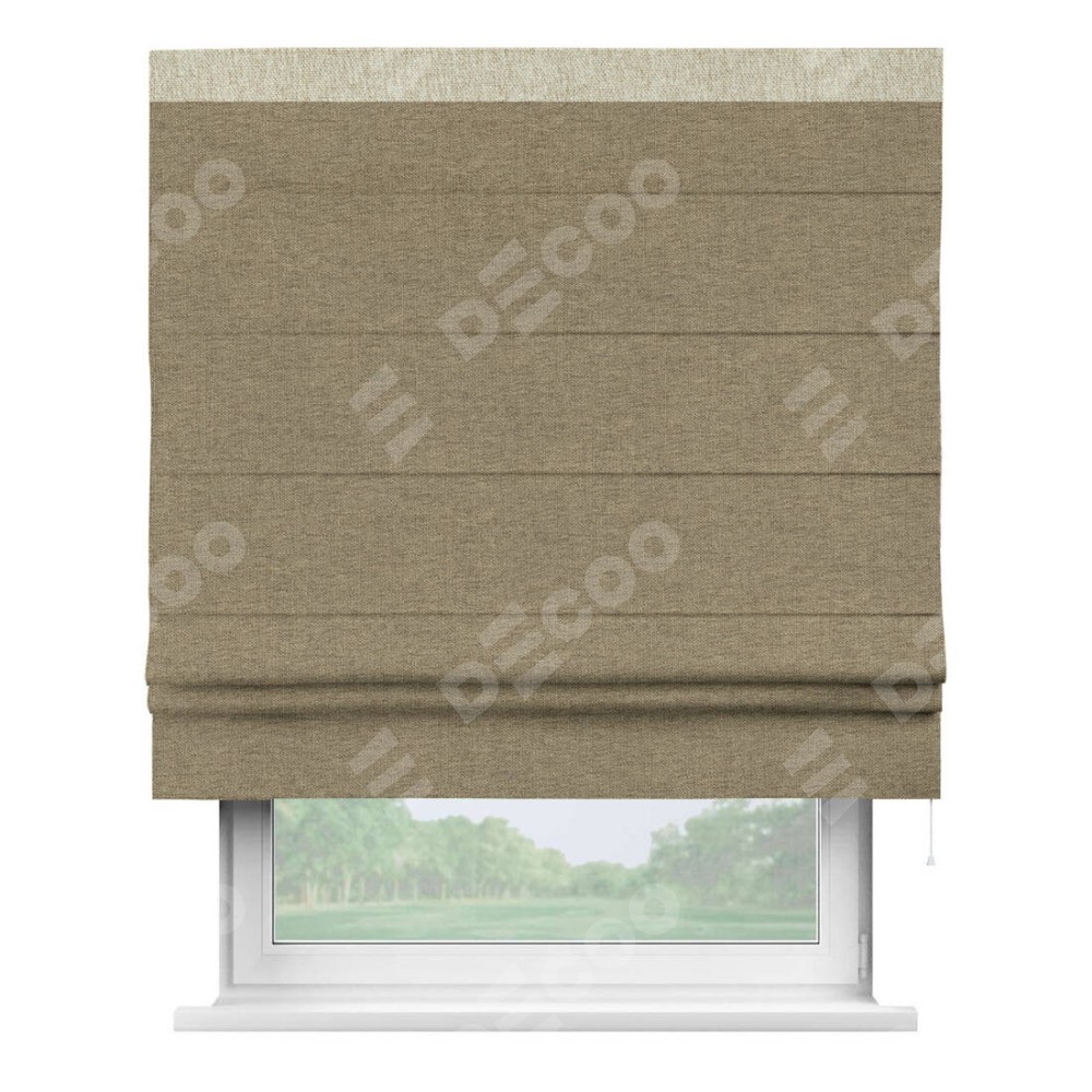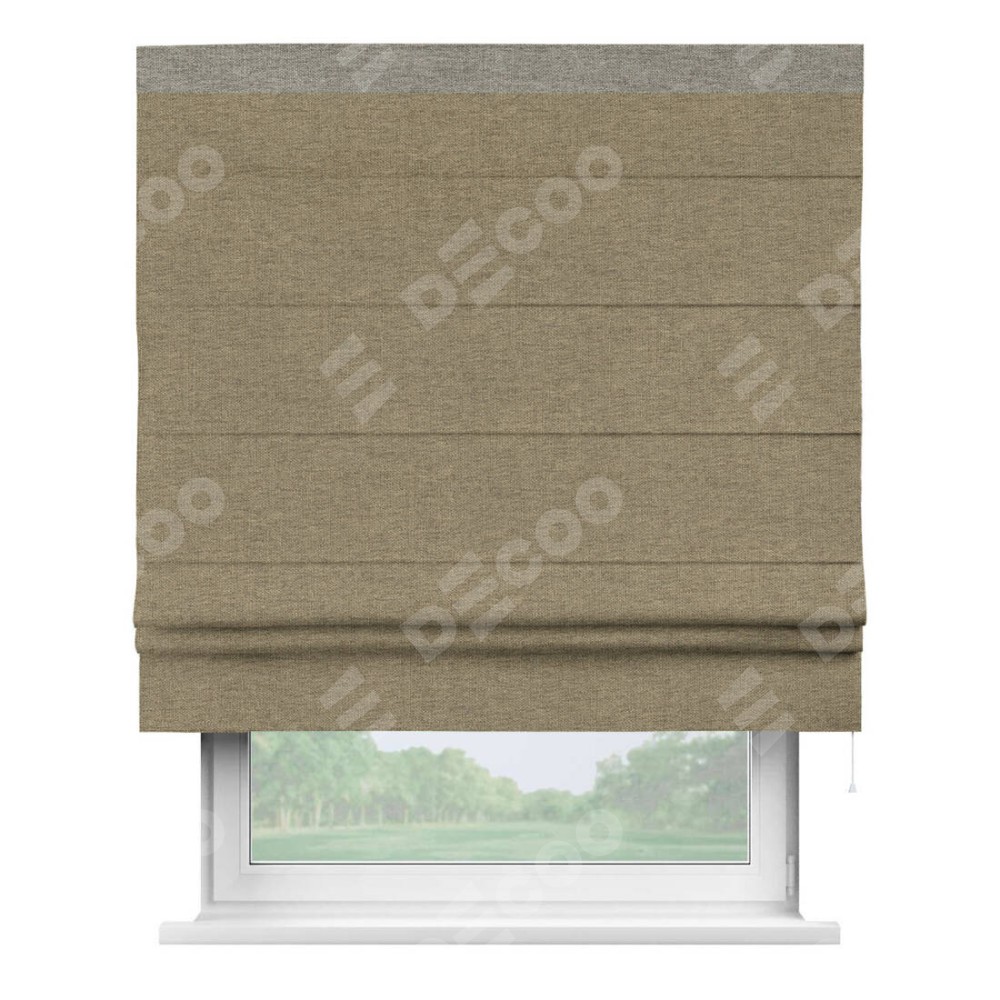 Римская штора производителя «Cortin», используется для проёма, пошита из ткани стиф димаут тёмно-бежевый, артикул 18085. Отделка шторы кантом «Кинг», ткань для канта используется из стифа разной расцветки на выбор. Имеет универсальный механизм и подходит для монтажа: на потолок, на стену и в нишу.