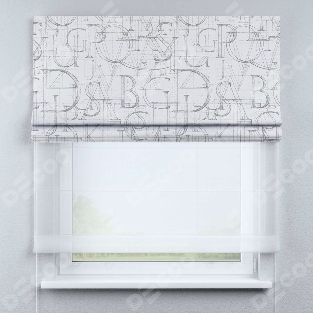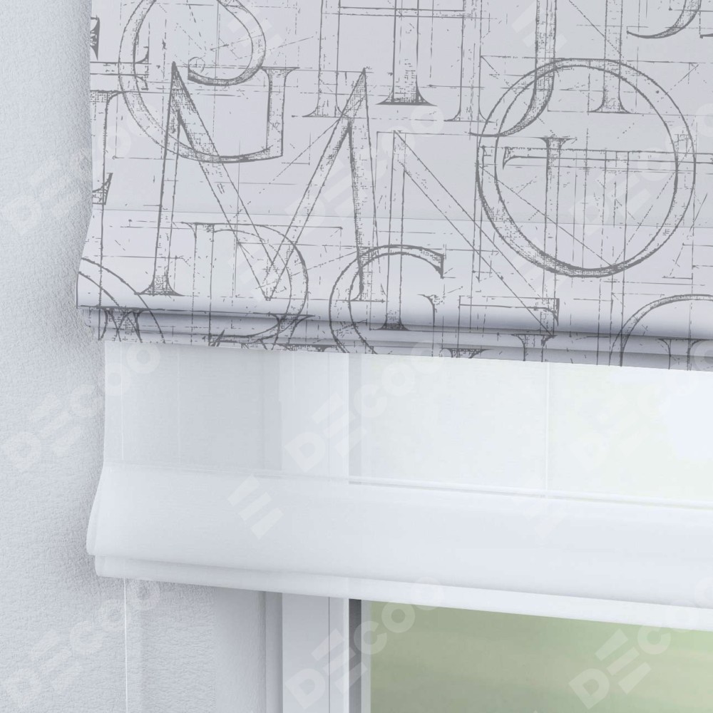 Римская штора день-ночь производителя «Cortin», используется для проёма, пошита из двух полотен, с лицевой блэкаут с нанесением сублимационной печати «Античные буквы», вторая ткань тюль (по стандарту комплектуется тюль белого цвета артикул V-01). Имеет универсальный механизм и подходит для монтажа: на потолок, на стену и в нишу.