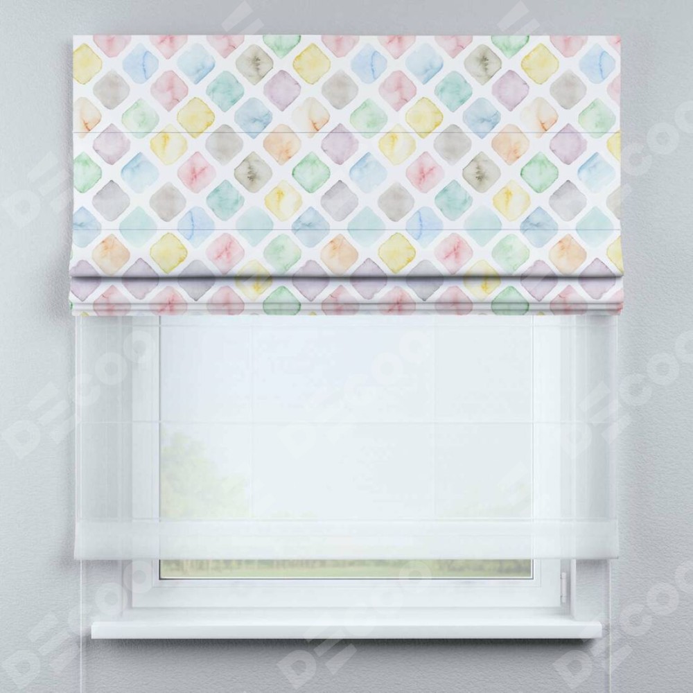 Римская штора день-ночь производителя «Cortin», используется для проёма, пошита из двух полотен, с лицевой блэкаут с нанесением сублимационной печати «Мозаика акварель», вторая ткань тюль (по стандарту комплектуется тюль белого цвета артикул V-01). Имеет универсальный механизм и подходит для монтажа: на потолок, на стену и в нишу.