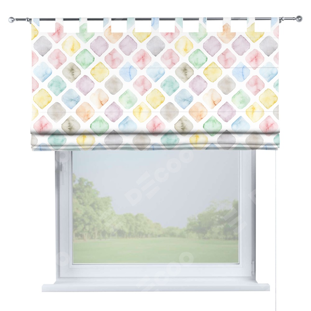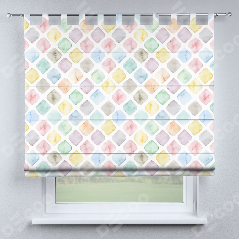 Римская штора производителя «Cortin», используется для проёма, пошита из ткани блэкаут с нанесением сублимационной печати «Мозаика акварель». Данная модель пошита на петлях, комплектуется на выбор круглым карнизом и подходит для монтажа на стену. Римская штора на петлях имеет простую систему регулировки высоты, отличительным преимуществом данной модели является простой способ монтажа. Достаточно повесить ее на трубу и штора готова!