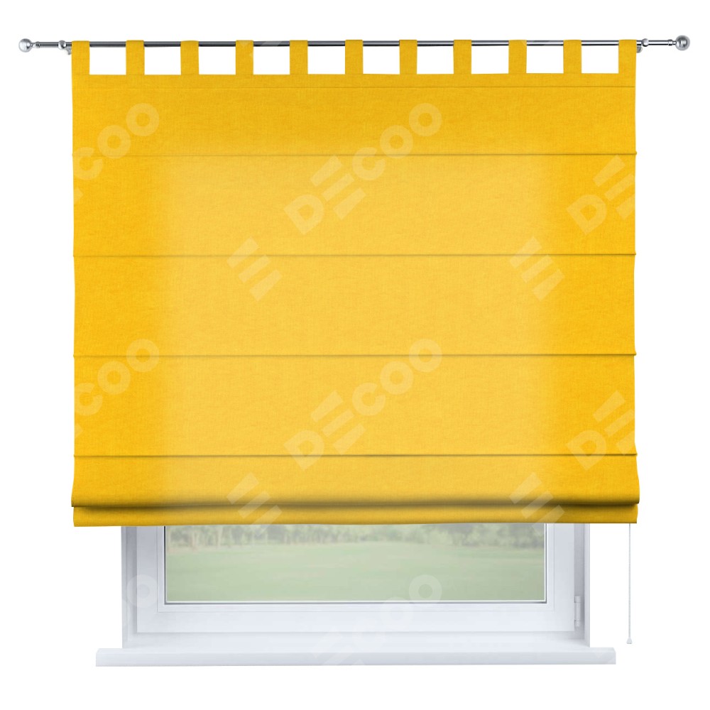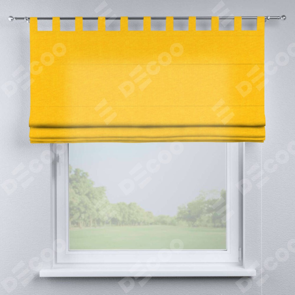 Римская штора производителя «Cortin», используется для проёма, пошита из ткани канвас желтый, артикул ткани v-344. Данная модель пошита на петлях, комплектуется на выбор круглым карнизом и подходит для монтажа на стену. Римская штора на петлях имеет простую систему регулировки высоты, отличительным преимуществом данной модели является простой способ монтажа. Достаточно повесить ее на трубу и штора готова!