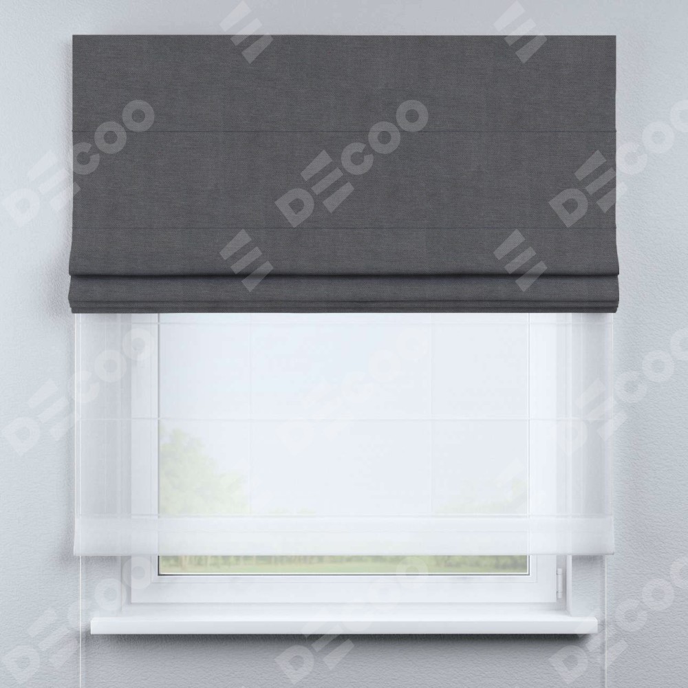 Римская штора день-ночь производителя «Cortin», используется для проёма, пошита из двух полотен, с лицевой стороны канвас мокрый асфальт артикул v-1083, вторая ткань тюль (по стандарту комплектуется тюль белого цвета артикул V-01). Имеет универсальный механизм и подходит для монтажа: на потолок, на стену и в нишу.